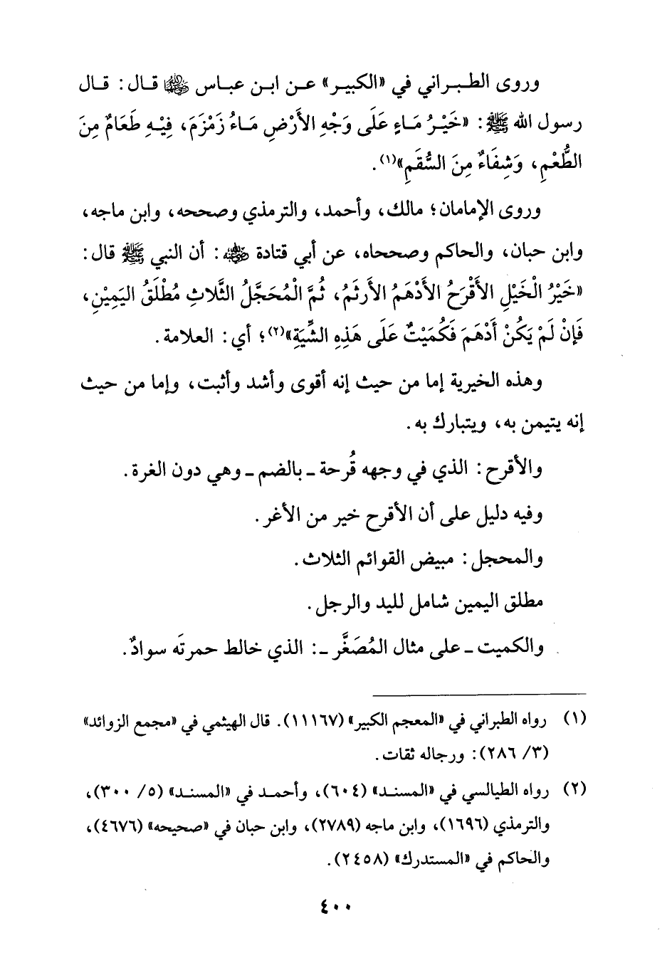 وروى الإمامان؛ مالك، وأحمد، والترمذي وصححه، وابن ماجه، وابن حبان، والحاكم وصححاه، عن أبي قتادة - رضي الله عنه -: أن النبي - صلى الله عليه وسلم - قال: "خَيْرُ الْخَيْلِ الأَقْرَحُ الأَدْهَمُ الأَرثَمُ، ثُمَّ الْمُحَجَّلُ الثَّلاثِ مُطْلَقُ اليَمِيْنِ، فَإنْ لَمْ يَكُنْ أَدْهَمَ فَكُمَيْتٌ عَلَى هَذهِ الشِّيَةِ" (¬2)؛ أي: العلامة.