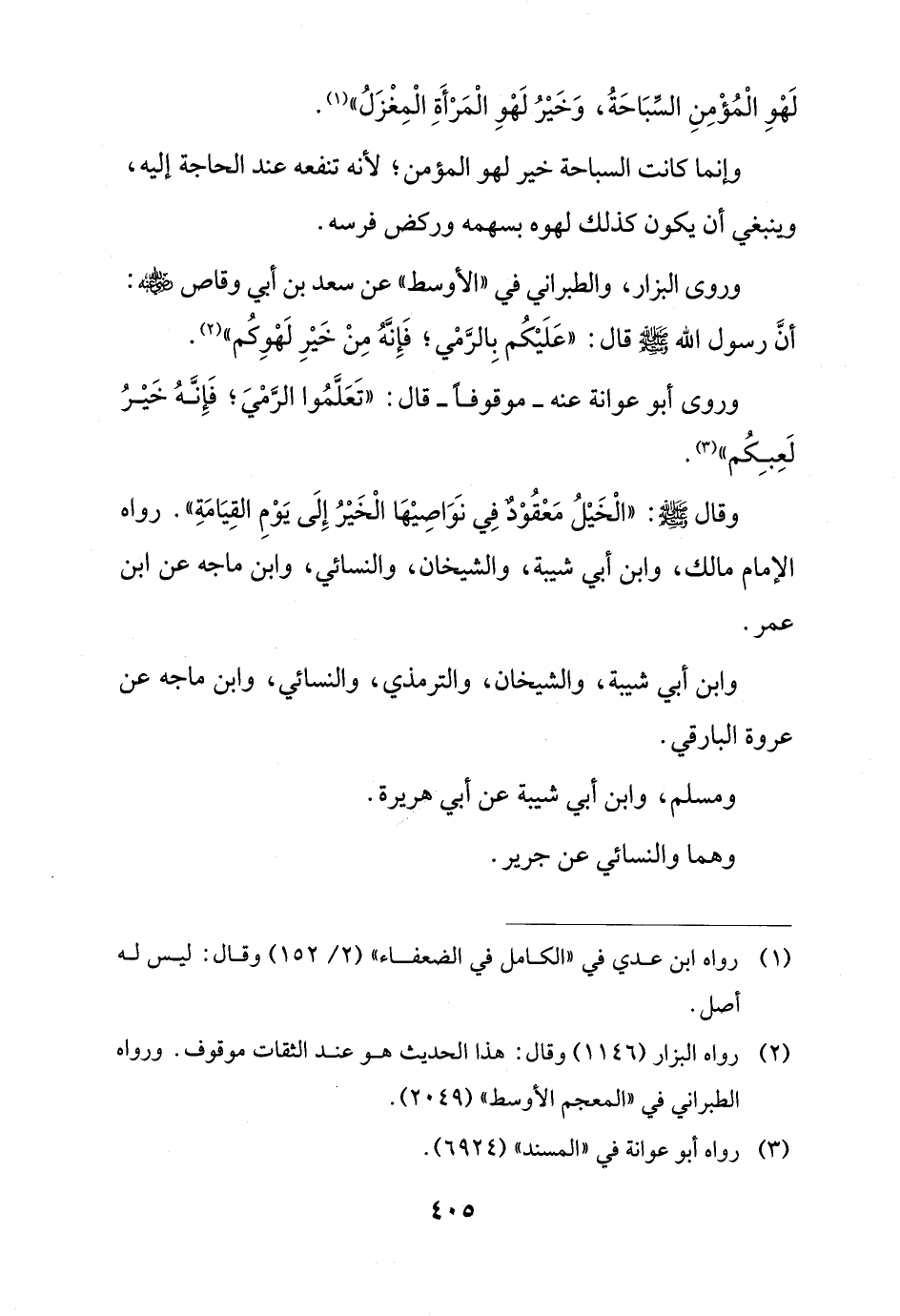 وروى البزار، والطبراني في "الأوسط" عن سعد بن أبي وقاص - رضي الله عنه -: أنَّ رسول الله - صلى الله عليه وسلم - قال: "عَلَيْكُم بِالرَّمْي؛ فَإِنَّهُ مِنْ خَيْرِ لَهْوِكُم" (¬2).