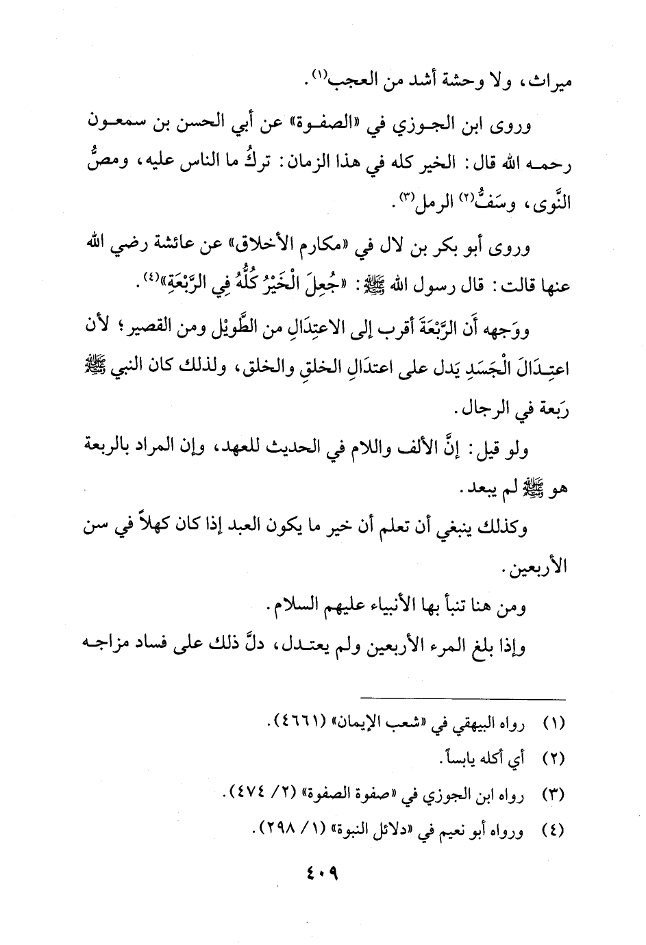 وروى أبو بكر بن لال في "مكارم الأخلاق" عن عائشة رضي الله عنها قالت: قال رسول الله - صلى الله عليه وسلم -: "جُعِلَ الْخَيْرُ كُلُّهُ فِي الرَّبْعَةِ" (¬4).