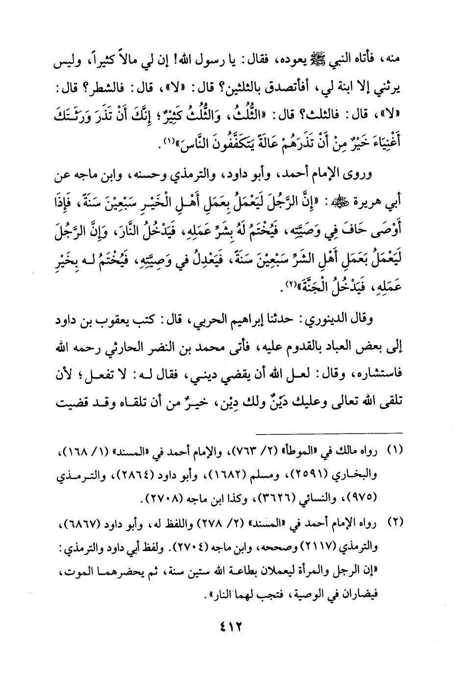 وروى الإمام أحمد، وأبو داود، والترمذي وحسنه، وابن ماجه عن أبي هريرة - رضي الله عنه -: "إِنَّ الرَّجُلَ لَيَعْمَلُ بِعَمَلِ أَهْلِ الْخَيْرِ سَبْعِيْنَ سَنَةً، فَإِذَا أَوْصَى حَافَ فِي وَصَيَّتِه، فَيُخْتَمُ لَهُ بِشَرِّ عَمَلِهِ، فَيَدْخُلُ النَّارَ، وَإِنَّ الرَّجُلَ لَيَعْمَلُ بَعَمَلِ أَهْلِ الشَّر سَبْعِيْنَ سَنَةً، فَيَعْدِلُ في وَصِيَّتِهِ، فَيُخْتَمُ له بِخَيْرِ عَمَلِهِ، فَيَدْخُلُ الْجَنَّةَ" (¬2).