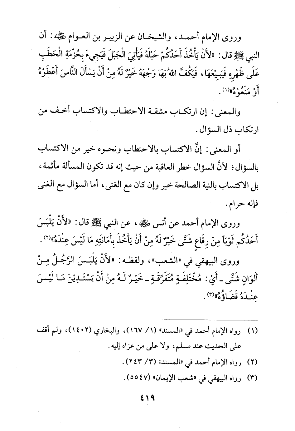وروى الإمام أحمد، والشيخان عن الزبير بن العوام - رضي الله عنه -: أن النبي - صلى الله عليه وسلم - قال: "لأَنْ يَأْخُذَ أَحَدُكُمْ حَبْلَهُ فَيَأْتِيَ الْجَبَلَ فَيَجِيءَ بِحُزْمَةِ الْحَطَبِ عَلَى ظَهْرِهِ فَيَبِيْعَهَا، فَيَكُفَّ اللهُ بَهَا وَجْهَهُ خَيْرٌ لَهُ مِنْ أَنْ يَسْأَلَ النَّاسَ أَعْطَوْهُ أَوْ مَنَعُوْهُ" (¬1).