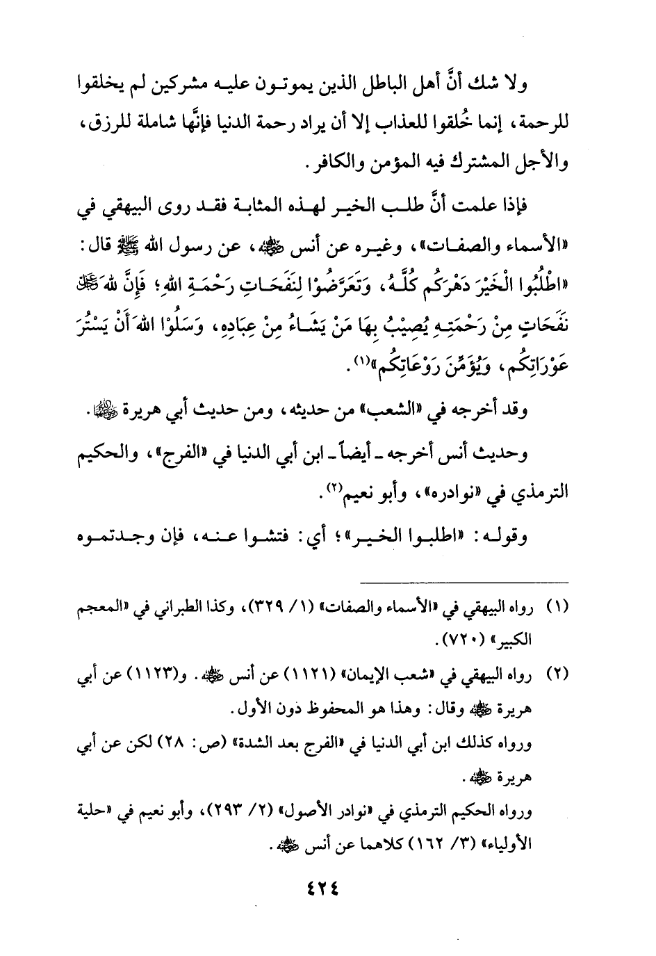فإذا علمت أنَّ طلب الخير لهذه المثابة فقد روى البيهقي في "الأسماء والصفات"، وغيره عن أنس - رضي الله عنه -، عن رسول الله - صلى الله عليه وسلم - قال: "اطْلُبُوا الْخَيْرَ دَهْرَكُم كُلَّهُ، وَتَعَرَّضُوْا لِنَفَحَاتِ رَحْمَةِ اللهِ؛ فَإِنَّ للهَ - عز وجل - نَفَحَاتٍ مِنْ رَحْمَتِهِ يُصِيْبُ بِهَا مَنْ يَشَاءُ مِنْ عِبَادِهِ، وَسَلُوْا اللهَ أَنْ يَسْتُرَ عَوْرَاتِكُم، وُيؤَمِّنَ رَوْعَاتِكُم" (¬1).