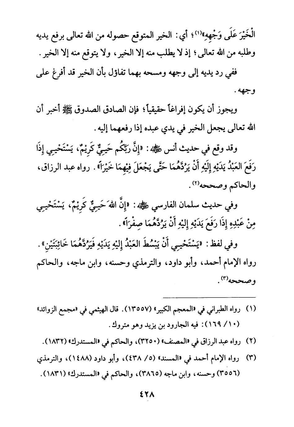 وفي حديث سلمان الفارسي - رضي الله عنه -: "إِنَّ اللهَ حَيِىٌّ كَرِيْمٌ، يَسْتَحْيِي مِنْ عَبْدِهِ إِذَا رَفَعَ يَدَيْهِ إِليْهِ أَنْ يَرُدَّهُمَا صِفْرًا".