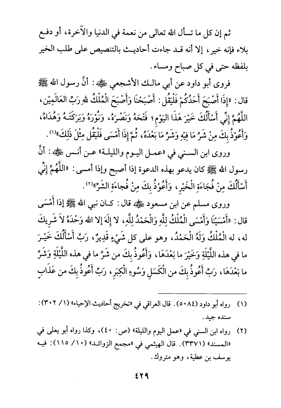 فروى أبو داود عن أبي مالك الأشجعي - رضي الله عنه -: أنَّ رسول الله - صلى الله عليه وسلم - قال: "إِذَا أَصْبَحَ أَحَدُكُمْ فَلْيَقُل: أَصْبَحْنَا وَأَصْبَحَ الْمُلْكُ للهِ رَبِّ العَالَمِيْن، اللَّهُمَّ إِنِّي أَسْألكَ خَيْرَ هَذَا اليَوْمِ؛ فَتْحَهُ وَنَصْرَهُ، وَنُوْرَهُ وَبَرَكتَهُ وَهُدَاهُ, وَأَعُوْذُ بِكَ مِنْ شَرِّ مَا فِيْهِ وَشَرِّ مَا بَعْدَهُ, ثُمَّ إِذَا أَمْسَى فَلْيقُل مِثْلَ ذَلِكَ" (¬1).