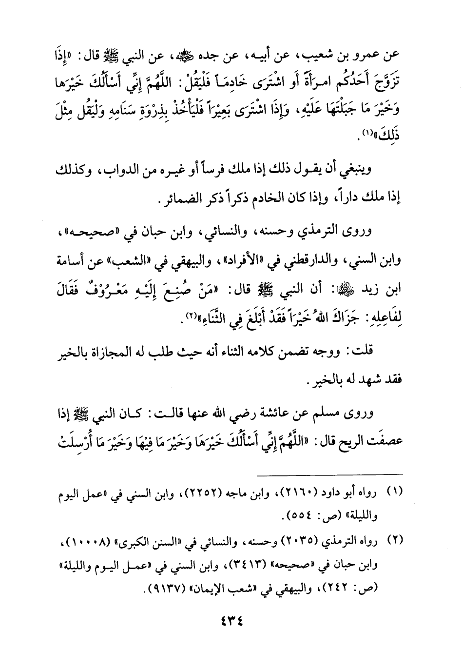 عن عمرو بن شعيب، عن أبيه، عن جده - رضي الله عنه -، عن النبي - صلى الله عليه وسلم - قال: "إِذَا تَزَوَّجَ أَحَدُكُم امرَأة أَو اشْتَرَى خَادِمًا فَلْيقُلْ: اللَّهُمَّ إِنِّي أَسْأَلُكَ خَيْرَها وَخَيْرَ مَا جَبَلْتَهَا عَلَيْهِ، وَإِذَا اشْتَرَى بَعِيْرًا فَلْيَأْخُذْ بِذِرْوَةِ سَنَامِهِ وَلْيَقُل مِثْلَ ذَلِكَ" (¬1).