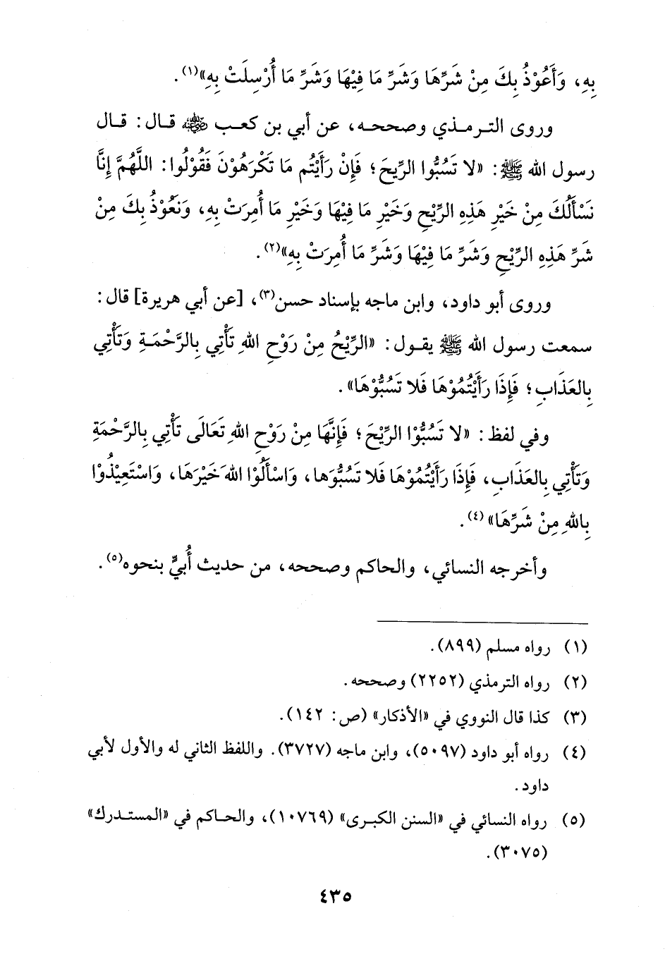 وروى الترمذي وصححه، عن أبي بن كعب - رضي الله عنه - قال: قال رسول الله - صلى الله عليه وسلم -: "لا تَسُبُّوا الرِّيحَ؛ فَإِنْ رَأَيْتُم مَا تَكْرَهُوْنَ فَقُوْلُوا: اللَّهُمَّ إِنَّا نَسْأَلُكَ مِنْ خَيْرِ هَذِهِ الرِّيْحِ وَخَيْرِ مَا فِيْهَا وَخَيْرِ مَا أُمِرَتْ بِهِ، وَنَعُوْذُ بِكَ مِنْ شَرِّ هَذِهِ الرّيْحِ وَشَرِّ مَا فِيْهَا وَشَرِّ مَا أُمِرَتْ بِهِ" (¬2).