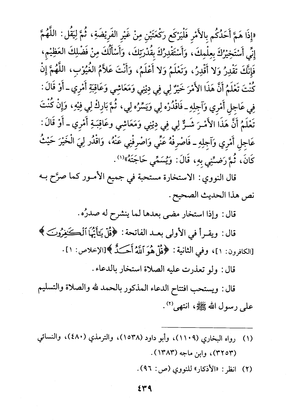 "إِذَا هَمَّ أَحَدُكُم بِالأَمْرِ فَلْيَرْكَع رَكْعَتَيْنِ مِنْ غَيْرِ الفَرِيْضَةِ، ثُمَّ لِيَقُلْ: اللَّهُمَّ إِنِّي أَسْتَخِيْرُكَ بِعِلْمِكَ، وَأَسْتَقْدِرُكَ بِقُدْرَتِكَ، وَأَسْألكَ مِنْ فَضْلِكَ العَظِيْمِ، فَإِنَّكَ تَقْدِرُ وَلا أَقْدِرُ، وَتَعْلَمُ وَلا أَعْلَمُ، وَأَنْتَ عَلاَّمُ الغُيُوْبِ، اللَّهُمَّ إِنْ كُنْتَ تَعْلَمُ أَنَّ هَذَا الأَمْرَ خَيْرٌ لِي فِي دِيْنِي وَمَعَاشِي وَعَاقِبَةِ أَمْرِي - أَوْ قَالَ: فِي عَاجِلِ أَمْرِي وَاجِلِهِ - فَاقْدُرْه لِي وَيسِّرُه لِي، ثُمَّ بَارِكْ لِي فِيْهِ، وَإِنْ كُنْتَ تَعْلَمُ أَنَّ هَذَا الأَمْرَ شَرٌّ لِي فِي دِيْنِي وَمَعَاشِي وعَاقِبَةِ أَمْرِي - أَوْ قَالَ: عَاجِلِ أَمْرِي وَاجِلِهِ - فَاصْرِفْهُ عَنِّي وَاصْرِفْنِي عَنْهُ، وَاقْدُر لِيَ الْخَيْرَ حَيْثُ كَانَ، ثُمَّ رَضِّنِي بِهِ، قَالَ: وُيسَمِّي حَاجَتَهُ" (¬1).