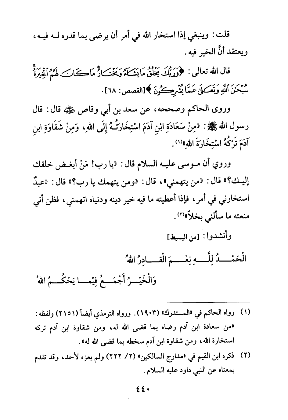 قلت: وينبغي إذا استخار الله في أمر أن يرضى بما قدره له فيه، ويعتقد أنَّ الخير فيه.