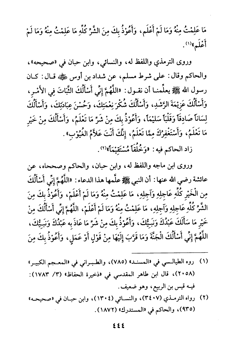 وروى ابن ماجه واللفظ له، وابن حبان، والحاكم وصححاه، عن عائشة رضي الله عنها: أن النبي - صلى الله عليه وسلم - علَّمها هذا الدعاء: "اللَّهُمَّ إِني أَسْألكَ مِن الْخَيْرِ كُلهِ عَاجِلِهِ وَآجِلِهِ، مَا عَلِمْتُ مِنْهُ وَمَا لَمْ أَعْلَمْ، وَأَعُوْذُ بِكَ مِنَ الشَّر كُلهِ عَاجِلِهِ وَآجِلِهِ، مَا عَلِمْتُ مِنْهُ وَمَا لَمْ أَعْلَمْ، اللَّهُمَّ إِنِّي أَسْألكَ مِنْ خَيْرِ مَا سَألكَ عَبْدُكَ وَنبِيكَ، وَأَعُوْذُ بِكَ مِنْ شَر مَا عَاذَ بِه عَبْدُكَ وَنبِيكَ، اللهُمَّ إِني أَسْألكَ الْجَنَّةَ وَمَا قَرَّبَ إِلَيْهَا مِنْ قَوْلٍ أَوْ عَمَلٍ، وَأَعُوْذُ بِكَ مِنَ