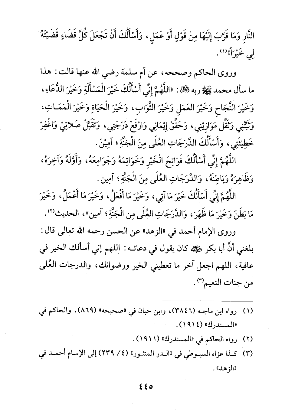 وروى الحاكم وصححه، عن أم سلمة رضي الله عنها قالت: هذا ما سأل محمَّد - صلى الله عليه وسلم - ربه عز وجل: "اللهُمَّ إِنِّي أَسْألكَ خَيْرَ الْمَسْألةِ وَخَيْرَ الدُّعَاءِ، وَخَيْرَ النَّجَاحِ وَخَيْرَ العَمَلِ وَخَيْرَ الثَّوَابِ، وَخَيْرَ الْحَيَاةِ وَخَيْرَ الْمَمَاتِ، وَثَبتنِي وَثَقِّل مَوَازيني، وَحَقِّقْ إِيْمَانِي وَارْفَعْ درَجَتِي، وَتَقَبَّلْ صَلاتِيْ وَاغْفِرْ خَطِيْئَتِي، وَأَسْألكَ الدَّرَجَاتِ العُلَى مِنَ الْجَنَّةِ؟ آمِيْنَ.