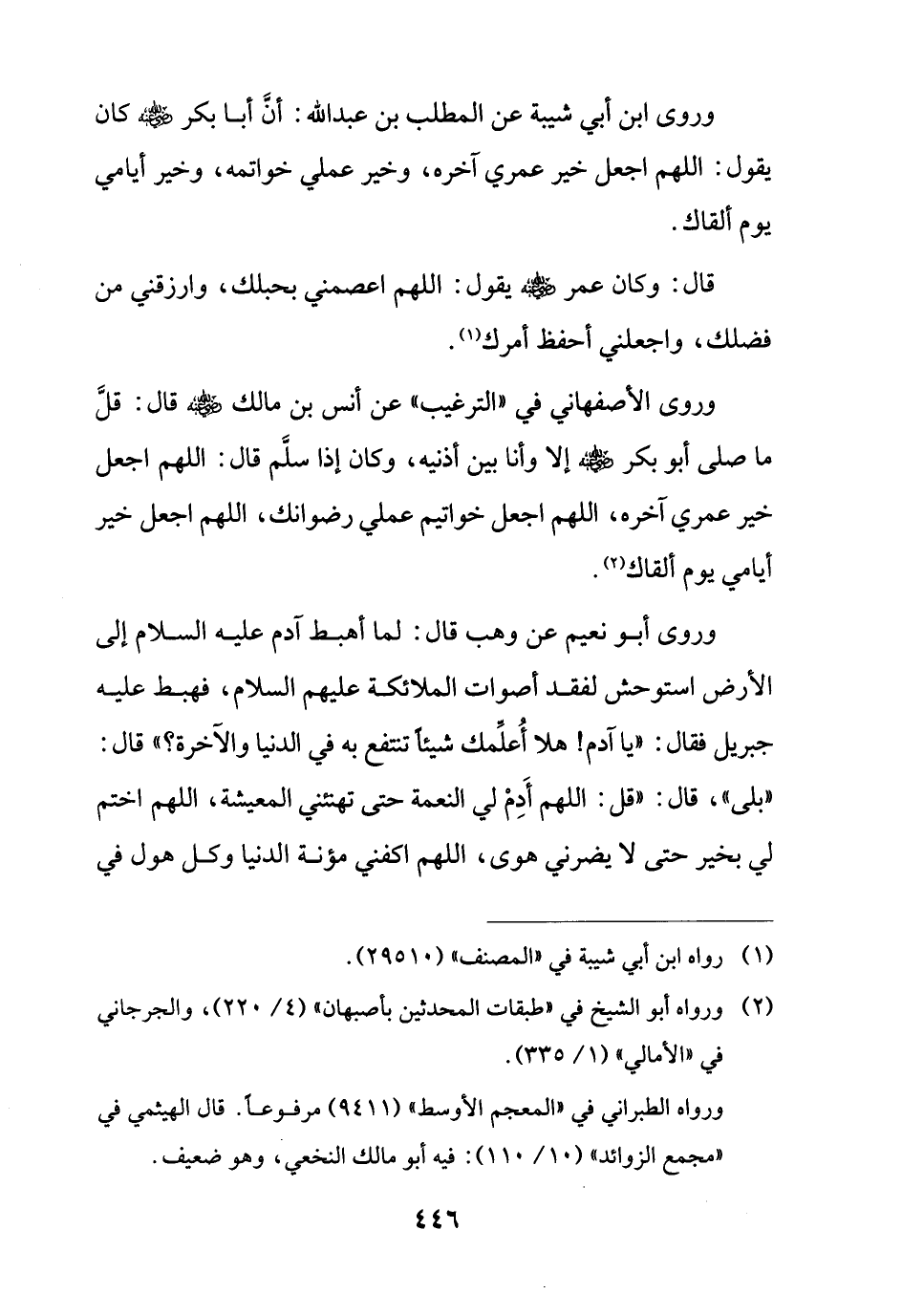 وروى أبو نعيم عن وهب قال: لما أهبط آدم عليه السلام إلى الأرض استوحش لفقد أصوات الملائكة عليهم السلام، فهبط عليه جبريل فقال: "يا آدم! هذا أُعلِّمك شيئًا تنتفع به في الدنيا والآخرة؟ " قال: "بلى، قال: "قل: اللهم أَدِمْ لي النعمة حتى تهنئني المعيشة، اللهم اختم لي بخير حتى لا يضرني هوى، اللهم اكفني مؤنة الدنيا وكل هول في