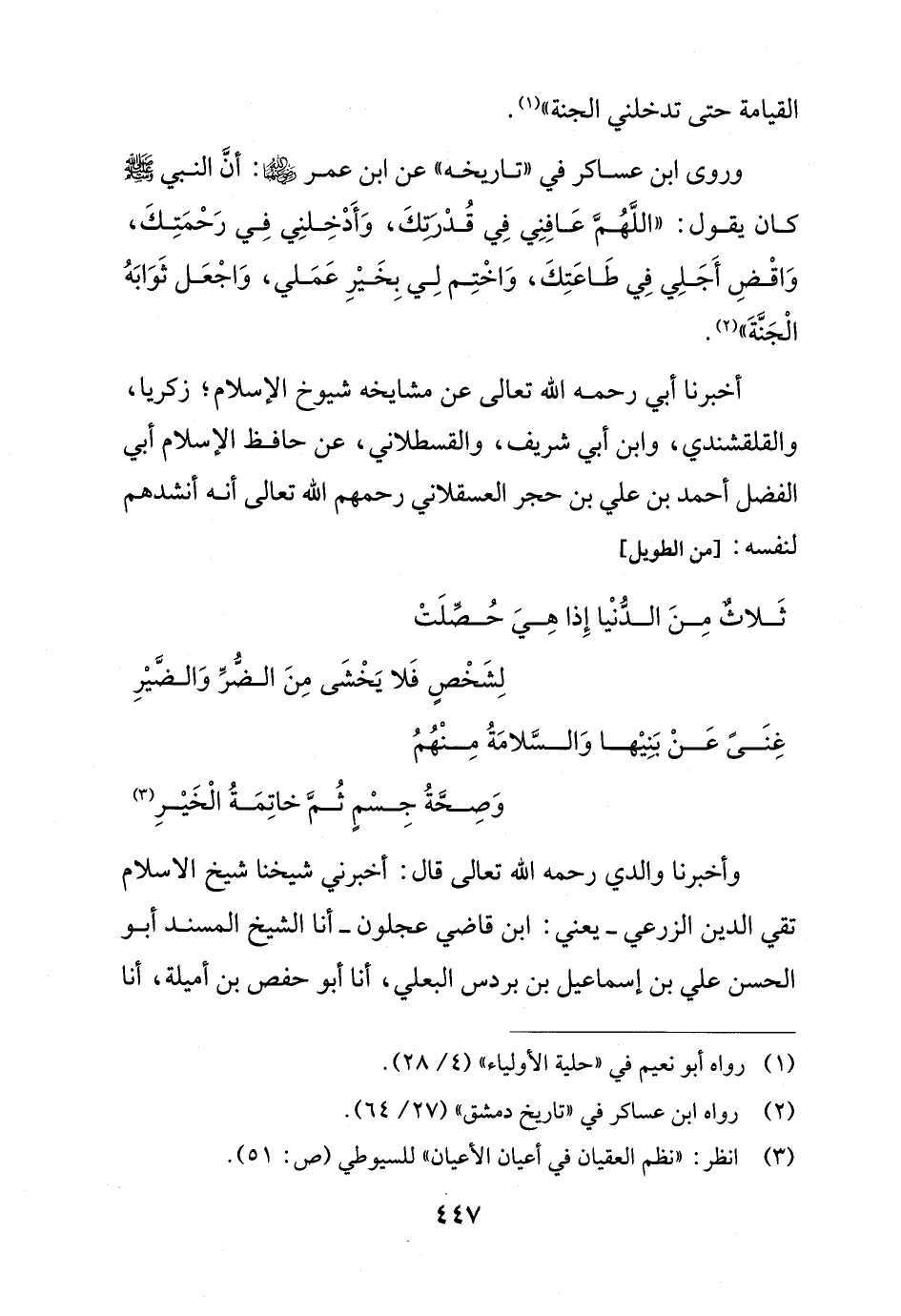 وروى ابن عساكر في "تاريخه" عن ابن عمر - رضي الله عنهما -: أنَّ النبي - صلى الله عليه وسلم - كان يقول: "اللهُمَّ عَافِنِي في قُدْرتكَ، وَأَدْخِلنِي في رَحْمَتِكَ، وَاقْضِ أَجَلِي في طَاعَتِكَ، وَاخْتِم لِي بِخَيْرِ عَمَلي، وَاجْعَل ثَوَابَهُ الْجَنَّةَ" (¬2).