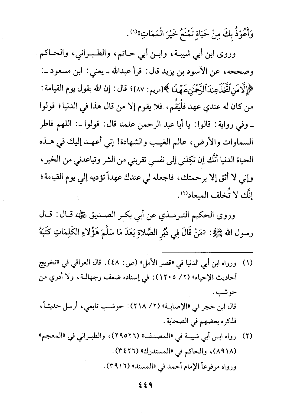 وروى ابن أبي شيبة، وابن أبي حاتم، والطبراني، والحاكم وصححه، عن الأسود بن يزيد قال: قرأ عبد الله -يعني: ابن مسعود -: {إِلَّا مَنِ اتَّخَذَ عِنْدَ الرَّحْمَنِ عَهْدًا} [مريم: 87]؛ قال: إن الله يقول يوم القيامة: من كان له عندي عهد فلْيَقُم، فلا يقوم إلا من قال هذا في الدنيا؛ قولوا - وفي رواية: قالوا: يا أبا عبد الرحمن علمنا قال: قولوا -: اللهم فاطر السماوات والأرض، عالم الغيب والشهادة! إني أعهد إليك في هذه الحياة الدنيا أنَّك إن تكِلني إلى نفسي تقربني من الشر وتباعدني من الخير، وإني لا أثق إلا برحمتك، فاجعله لي عندك عهداً تؤديه إلى يوم القيامة؛ إنَّك لا تُخلف الميعاد (¬2).