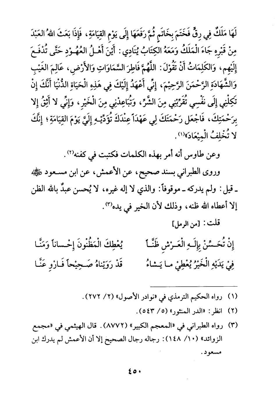 لَهَا ملكٌ في رِقٍّ فَخَتَمَ بِخَاتَمٍ ثُمَّ رَفَعَهَا إِلَى يَوْمِ القِيَامَةِ، فَإِذَا بَعَثَ اللهُ العَبْدَ مِنْ قَبْرِهِ جَاءَ الْمَلَكُ وَمَعَهُ الكِتَابُ يُنَادِي: أَيْنَ أَهْلُ العُهُوْدِ حَتَّى تُدْفَعَ إِلَيْهِم، وَالكَلِمَاتُ أَنْ تَقُوْلَ: اللَّهُمَّ فَاطِرَ السَّمَاوَاتِ وَالأَرْضِ، عَالِمَ الغَيْبِ وَالشَّهَادةِ الرَّحْمَنَ الرَّحِيْمَ، إِنِّي أَعْهَدُ إِلَيْكَ في هَذه الْحَيَاةِ الدُّنْيَا أَنَّكَ إِنْ تَكِلْنِي إِلَى نفسِي تُقَرِّبْنِي مِنَ الشَّرِّ، وَتُبَاعِدْنِي مِنَ الْخَيْرِ، وَإِنِّي لا أَثِقُ إِلا بِرَحْمَتِكَ، فَاجْعَل رَحْمَتَكَ لِي عَهْدًا عِنْدَكَ تُؤَدِّيْهِ إِلَيَّ يَوْمَ القِيَامَةِ، إِنَّكَ لا تُخْلِفُ الْمِيْعَاد" (¬1).