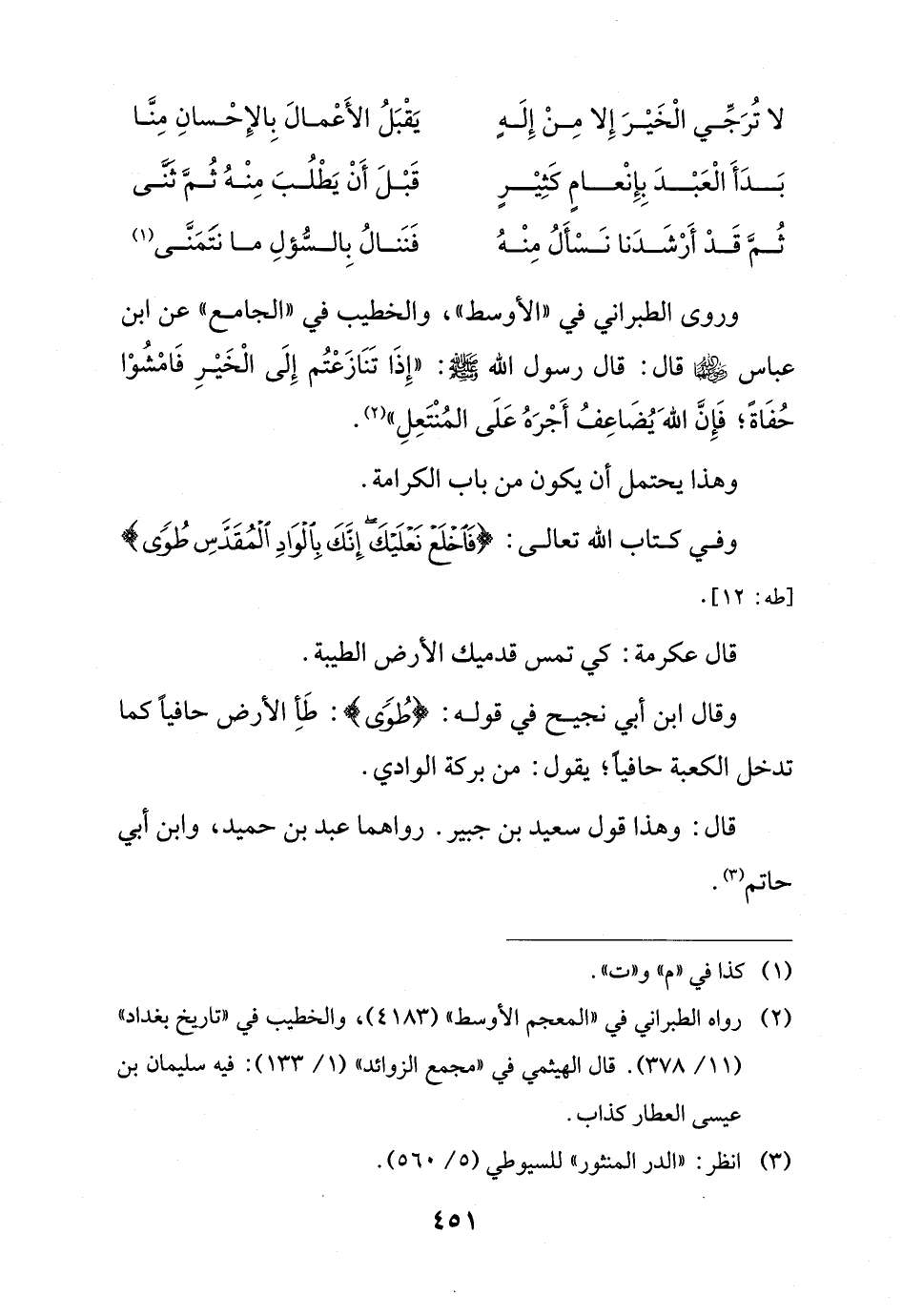 وقال ابن أبي نجيح في قوله: {طُوًى}: طَأِ الأرض حافياً كما تدخل الكعبة حافيًا؛ يقول: من بركة الوادي.