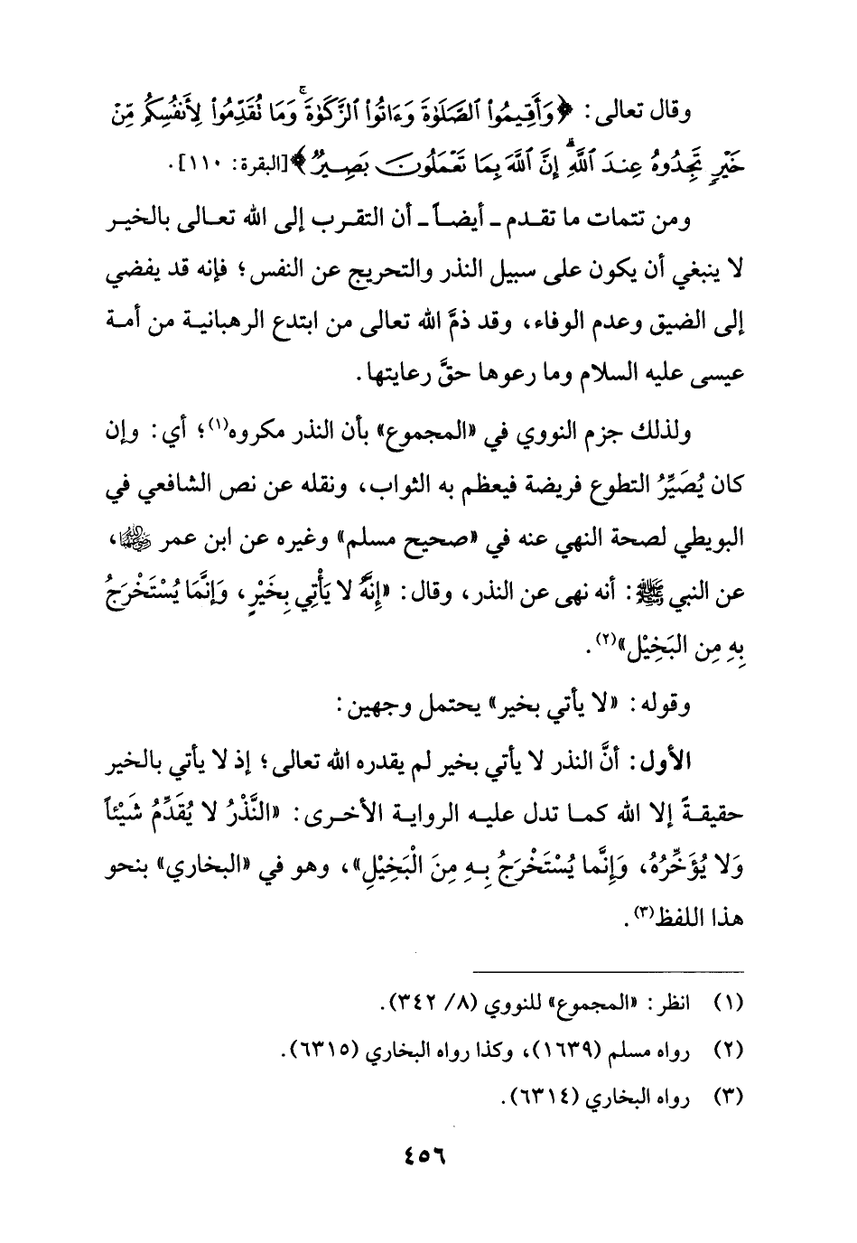 ولذلك جزم النووي في "المجموع" بأن النذر مكروه (¬1)؛ أي: وإن كان يُصَيِّرُ التطوع فريضة فيعظم به الثواب، ونقله عن نص الشافعي في البويطي لصحة النهي عنه في "صحيح مسلم" وغيره عن ابن عمر - رضي الله عنهما -، عن النبي - صلى الله عليه وسلم -: أنه نهى عن النذر، وقال: "إِنه لا يَأتِي بِخَيْر، وَإنَّما يُسْتَخْرَجُ بِهِ مِن البَخِيْل" (¬2).