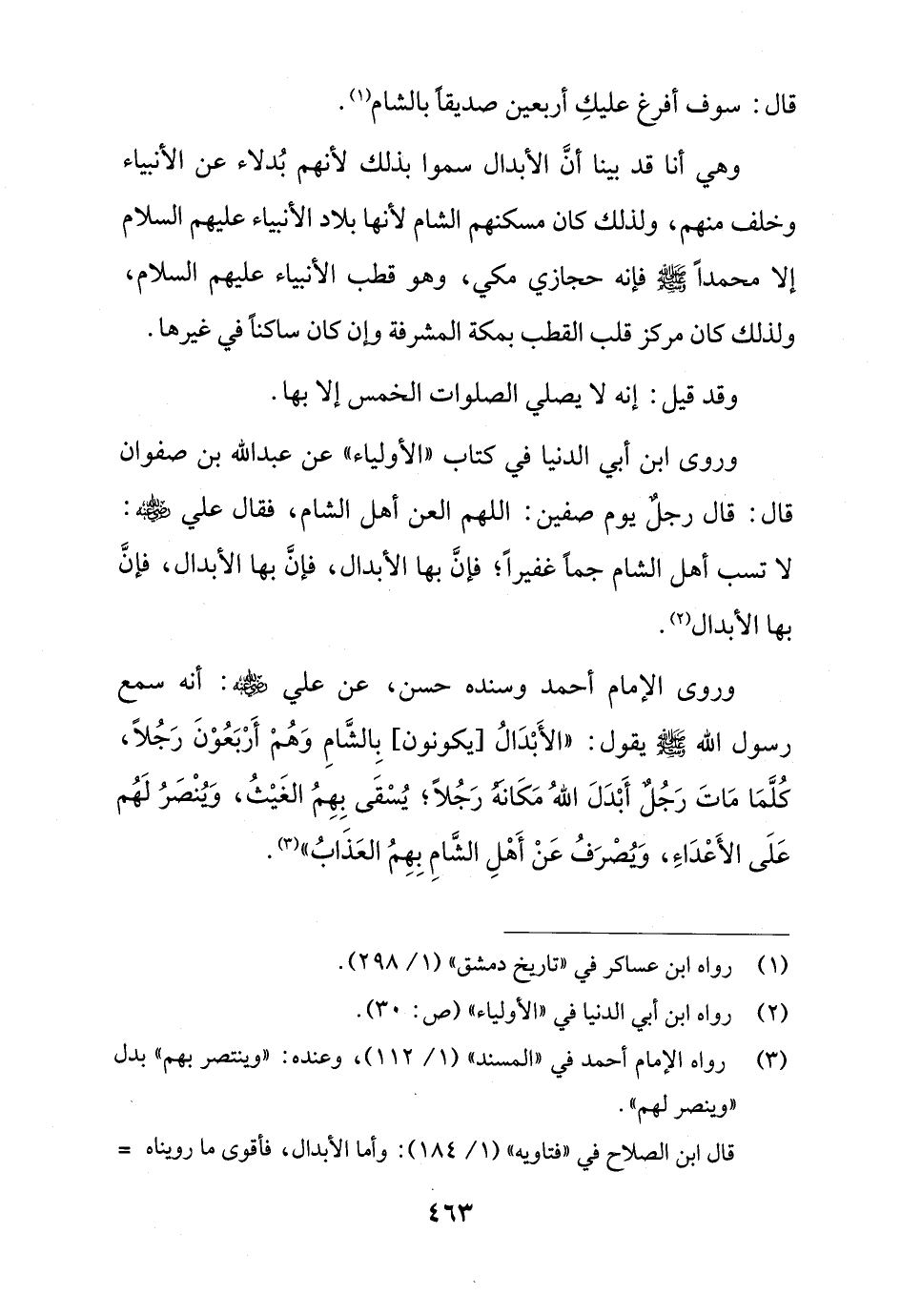 وروى الإِمام أحمد وسنده حسن، عن علي - رضي الله عنه -: أنه سمع رسول الله - صلى الله عليه وسلم - يقول: "الأَبْدَالُ [يكونون] بِالشَّامِ وَهُمْ أَرْبَعُوْنَ رَجُلاً، كُلَّمَا مَاتَ رَجُلٌ أَبْدَلَ اللهُ مَكَانه رَجُلاً؟ يُسْقَى بِهِمُ الغَيْثُ، وَيُنْصَرُ لَهُم عَلَى الأَعْدَاءِ، وَيُصْرَفُ عَنْ أَهْلِ الشَّامِ بِهِمُ العَذَابُ" (¬3).