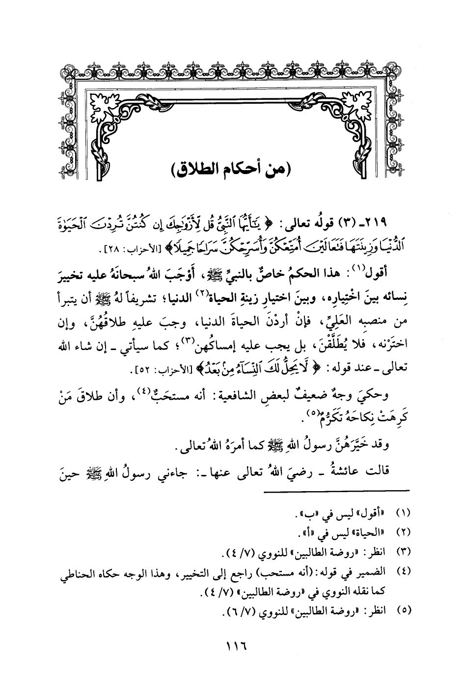 219 - (3) قولُه تعالى: {يَاأَيُّهَا النَّبِيُّ قُلْ لِأَزْوَاجِكَ إِنْ كُنْتُنَّ تُرِدْنَ الْحَيَاةَ الدُّنْيَا وَزِينَتَهَا فَتَعَالَيْنَ أُمَتِّعْكُنَّ وَأُسَرِّحْكُنَّ سَرَاحًا جَمِيلًا} [الأحزاب: 28].