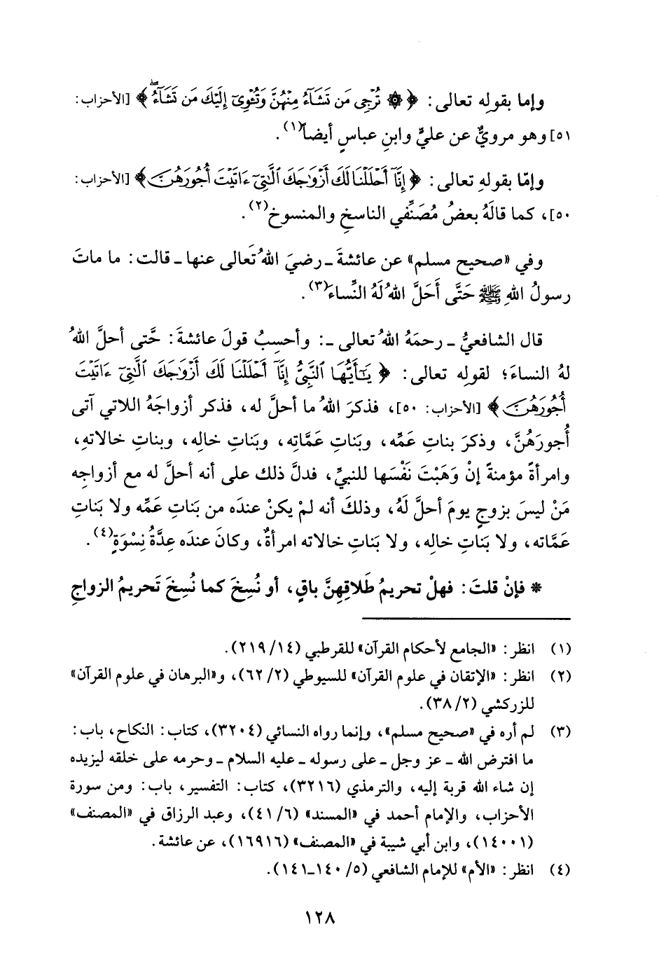 قال الشافعيُّ -رحمَهُ اللهُ تعالى-: وأحسِبُ قولَ عائشةَ: حَّتى أحلَّ اللهُ لهُ النساءَ؛ لقوله تعالى: {يَاأَيُّهَا النَّبِيُّ إِنَّا أَحْلَلْنَا لَكَ أَزْوَاجَكَ اللَّاتِي آتَيْتَ أُجُورَهُنَّ} [الأحزاب: 50]، فذكرَ اللهُ ما أحلَّ له، فذكر أزواجَهُ اللاتي آتى أُجورَهُنَّ، وذكرَ بناتِ عَمّه، وبَناتِ عَمَّاتِه، وبَناتِ خالِه، وبناتِ خالاتهِ، وامرأةً مؤمنةً إنْ وَهبْتَ نَفْسَها للنبيّ، فدلَّ ذلك على أنه أحلَّ له مع أزواجِه مَنْ ليسَ بزوجٍ يومَ أحلَّ لَهُ، وذلكَ أنه لم يكنْ عندَه من بَناتِ عَمِّه ولا بَناتِ عَمَّاته، ولا بَناتِ خالِه، ولا بَناتِ خالاته امرأةٌ، وكانَ عندَه عِدَّةُ نِسْوَةٍ (¬4).