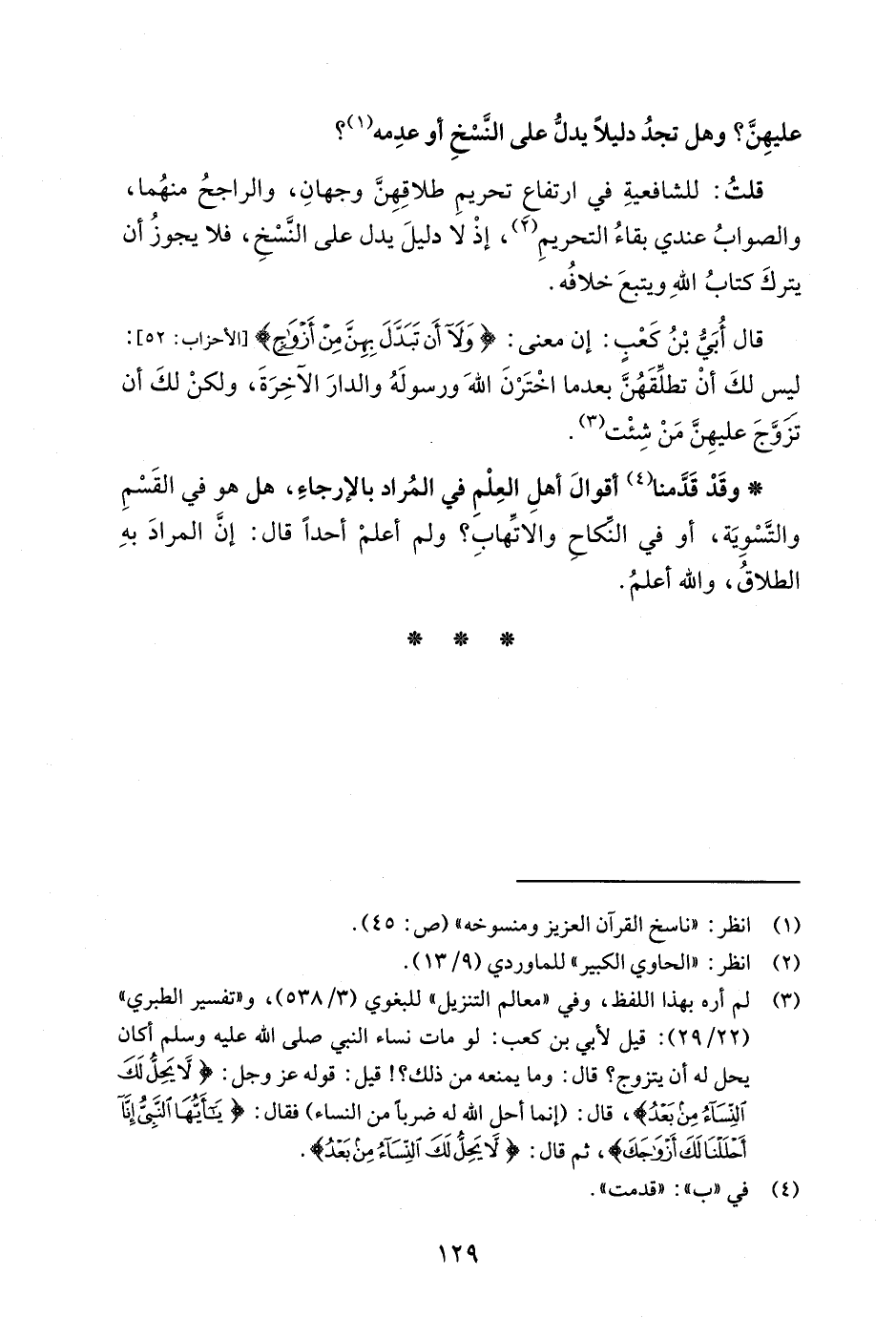 (¬3) لم أره بهذا اللفظ، وفي "معالم التنزيل" للبغوي (3/ 538)، و"تفسير الطبري" (29/ 22): قيل لأبي بن كعب: لو مات نساء النبي صلى الله عليه وسلم أكان يحل له أن يتزوج؟ قال: وما يمنعه من ذلك؟! قيل: قوله عز وجل: {لا يَحِلُّ لَكَ النِّسَاءُ مِنْ بَعْدُ}، قال: (إنما أحل الله له ضرباً من النساء) فقال: {يَاأَيُّهَا النَّبِيُّ إِنَّا أَحْلَلْنَا لَكَ أَزْوَاجَكَ}، ثم قال: {لا يَحِلُّ لَكَ النِّسَاءُ مِنْ بَعْدُ}.