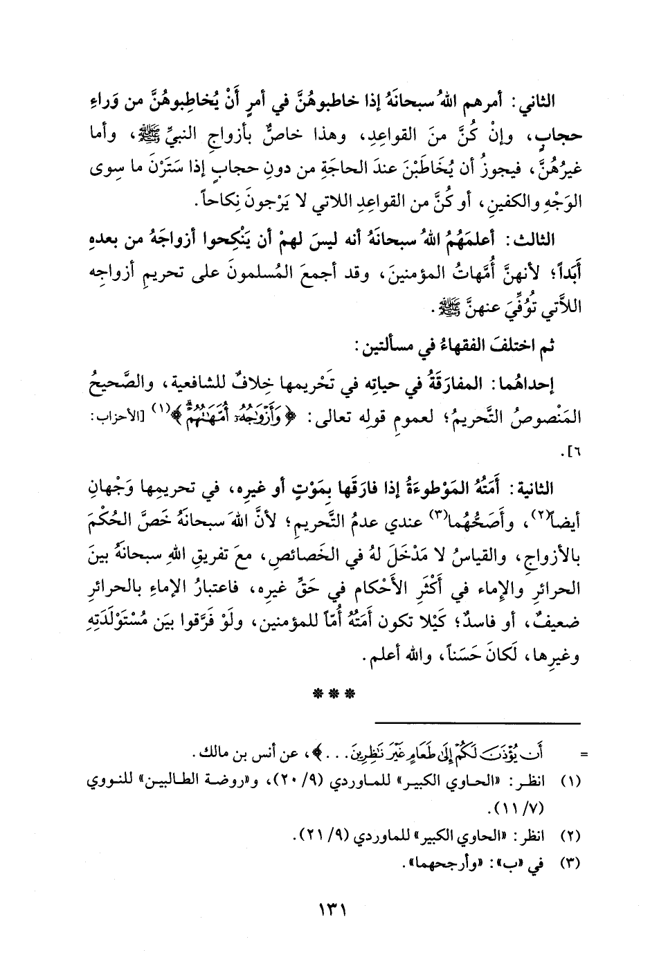 الثالث: أعلمَهُمُ اللهُ سبحانَهُ أنه ليسَ لهمْ أن يَنْكِحوا أزواجَهُ من بعدهِ أَبَداً؛ لأنهنَّ أُمَّهاتُ المؤمنينَ، وقد أجمعَ المُسلمونَ على تحريمِ أزواجِه اللَّاتي تُوُفَيَ عنهنَّ - صلى الله عليه وسلم -.