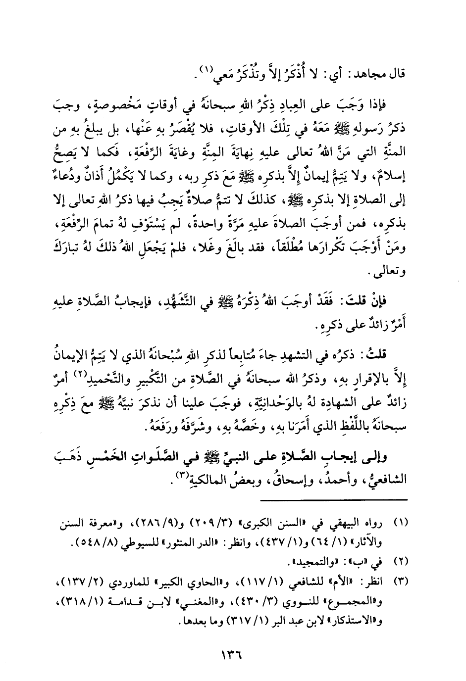 فإذا وَجَبَ على العِبادِ ذِكْرُ اللهِ سبحانه في أوقاتٍ مَخْصوصةٍ، وجبَ ذكرُ رَسولهِ - صلى الله عليه وسلم - مَعَهُ في تِلْكَ الأوقاتِ، فلا يُقْصَرُ بهِ عَنْها، بل يبلغُ بهِ من المنَّةِ التي مَنَّ اللهُ تعالى عليهِ نِهايَةَ المِنَّةِ وغايَةَ الرِّفْعَةِ، فَكما لا يَصِحُّ إسلامٌ، ولا يَتِمُّ إيمان إِلَّا بذكرِه - صلى الله عليه وسلم - مَعَ ذكرِ ربه، وكما لا يَكْمُلُ أَذان ودُعاءٌ إلى الصلاةِ إلا بذكرِه - صلى الله عليه وسلم -، كذلكَ لا تتمُّ صلاةٌ يَجِبُ فيها ذكرُ اللهِ تعالى إلا بذكرِه، فمن أوجَبَ الصلاةَ عليهِ مَرَّةً واحدةً، لم يَسْتَوْفِ لهُ تمامَ الرِّفْعَةِ، ومَنْ أَوْجَبَ تكرارَها مُطْلَقاً، فقد بالَغَ وغَلا، فلف يَجْعَلِ اللهُ ذلكَ لهُ تبارَكَ وتعالى.