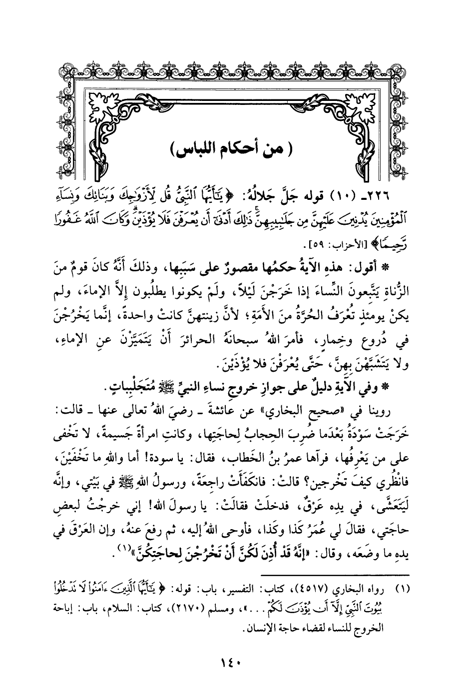 226 - (10) قوله جَلَّ جَلالُهُ: {يَاأَيُّهَا النَّبِيُّ قُلْ لِأَزْوَاجِكَ وَبَنَاتِكَ وَنِسَاءِ الْمُؤْمِنِينَ يُدْنِينَ عَلَيْهِنَّ مِنْ جَلَابِيبِهِنَّ ذَلِكَ أَدْنَى أَنْ يُعْرَفْنَ فَلَا يُؤْذَيْنَ وَكَانَ اللَّهُ غَفُورًا رَحِيمًا (59)} [الأحزاب: 59].