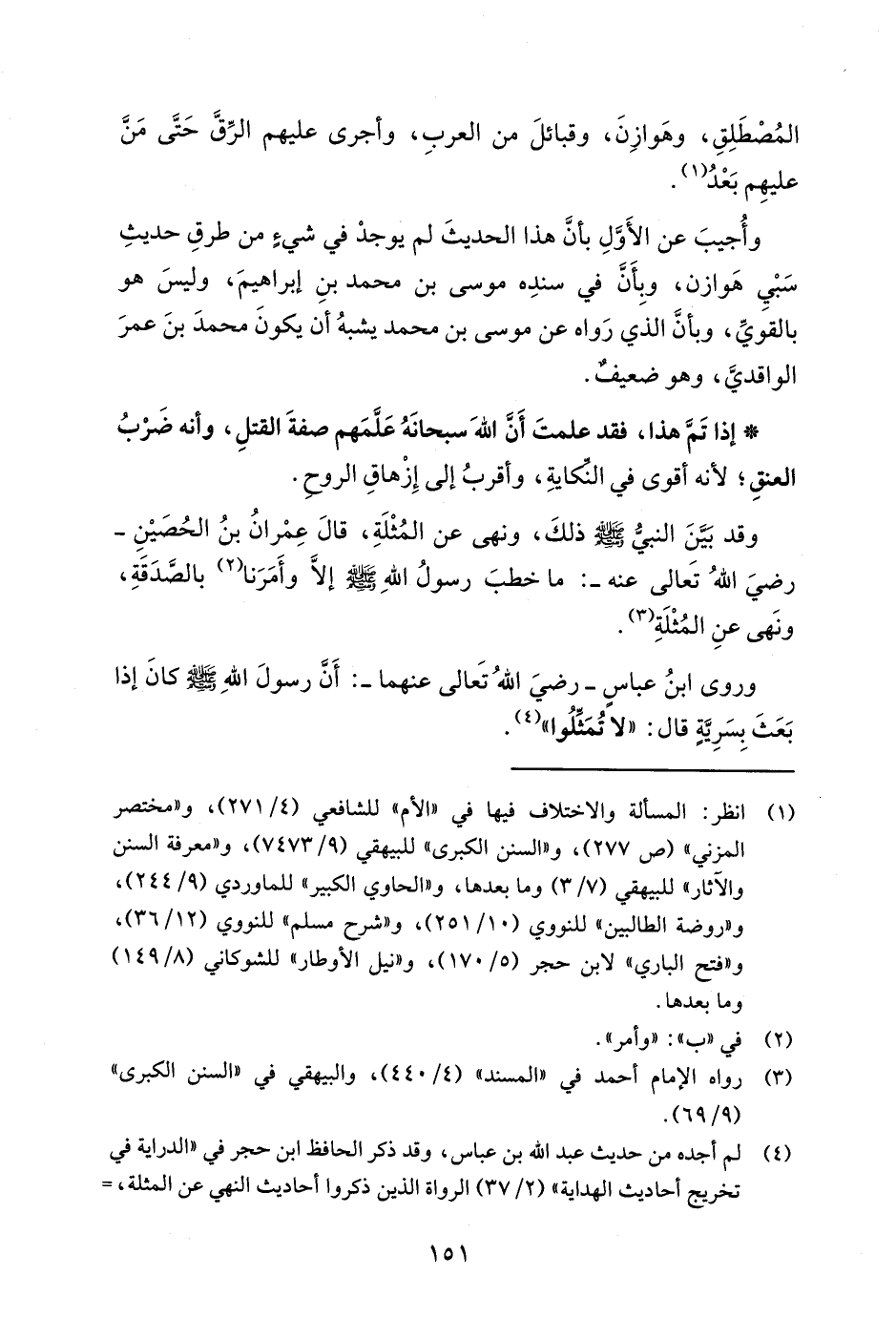 وروى ابنُ عباس -رضيَ اللهُ تَعالى عنهما-: أَنَّ رسولَ اللهِ - صلى الله عليه وسلم - كانَ إذا بَعَثَ بِسَرِيَّةٍ قال: "لا تُمَثِّلُوا" (¬4).
