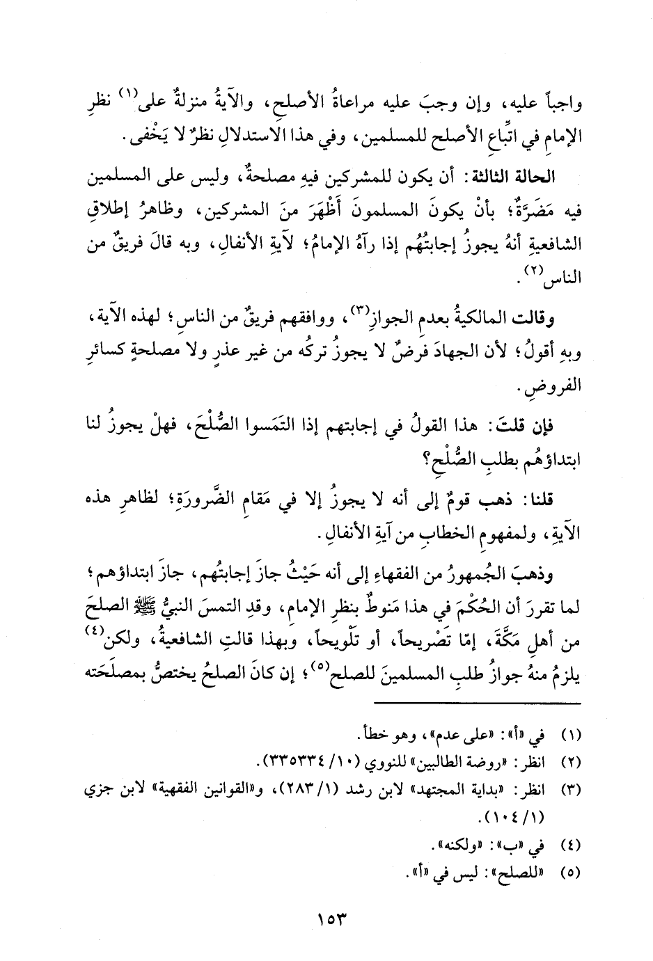الحالة الثالثة: أن يكون للمشركين فيهِ مصلحةٌ، وليس على المسلمين فيه مَضَرَّةٌ؛ بأنْ يكونَ المسلمونَ أَظْهَرَ منَ المشركين، وظاهرُ إطلاقِ الشافعيةِ أنهُ يجوزُ إجابتُهُم إذا رآهُ الإمامُ؛ لآيةِ الأنفالِ، وبه قَالَ فريقٌ من الناس (¬2).
