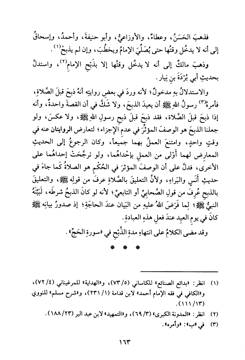 والاستدلالُ بهِ مدخولٌ؛ لأنه وردَ في بعضِ روايتِه أنهُ ذبحَ قبلَ الصَّلاةِ، فأمرهُ (¬3) رسولُ اللهِ - صلى الله عليه وسلم - أن يعيدَ الذبحَ، ولا شَك في أن القصةَ واحدةٌ، وأنه إذا ذبحَ قبلَ الصَّلاة، فقد ذبحَ قبلَ ذبحِ رسولِ اللهِ - صلى الله عليه وسلم -، ولا عكسَ، ولو جعلنا الذبحَ هو الوصفَ المؤثّرَ في عدم الإِجزاء؛ لتعارض الروايتان عنه في وقتٍ واحدٍ، وامتنعَ العملُ بهما جمَيعاً، وكان الرجوعُ إلى الحديثِ المعارِض لهما أَوْلى من العملِ بإحداهُما، ولو ترجَّحَتْ إحداهُما على الأخرى، فدلَّ على أن الوصفَ المؤثرَ في الحُكْمِ هو الصلاةُ كَما جاءَ في حديثِ أَنسٍ والبَراءِ، ولأنَّ التعليقَ بالصَّلاةِ عرفَ من قوله - صلى الله عليه وسلم -، والتعليقَ بالذبحِ عُرِفَ من قولِ الصَّحابِيِّ أو التابعيِّ؛ لأنه لو كانَ الذبحُ شرطَه، لَبَيَّنَهُ النبيُّ - صلى الله عليه وسلم -؛ لِما فَرَضَ اللهُ عليهِ من البَيان عندَ الحاجَةِ؛ إذ صدورُ بيانِه - صلى الله عليه وسلم - كانَ في يومِ العيِد عندَ فعلِ هذهِ العبادةِ.