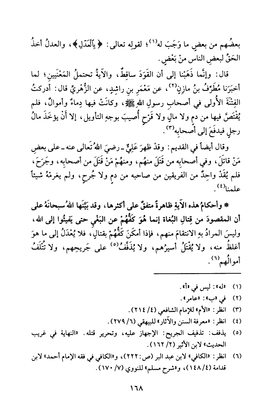 وقال أيضًا في القديم: وقدْ ظهرَ عَلِيٌّ -رضيَ اللهُ تَعالى عنه - على بعضِ مَنْ قاتَلَ، وفي أصحابِه من قَتَلَ منهُم، ومنهُمْ مَنْ قَتلَ من أصحابِه، وجَرَحَ، فلم يُقَد واحِدٌ من الفريقين من صاحبه من دمِ ولا جُرحٍ، ولم يغرمْهُ شيئًا علمنا (¬4).