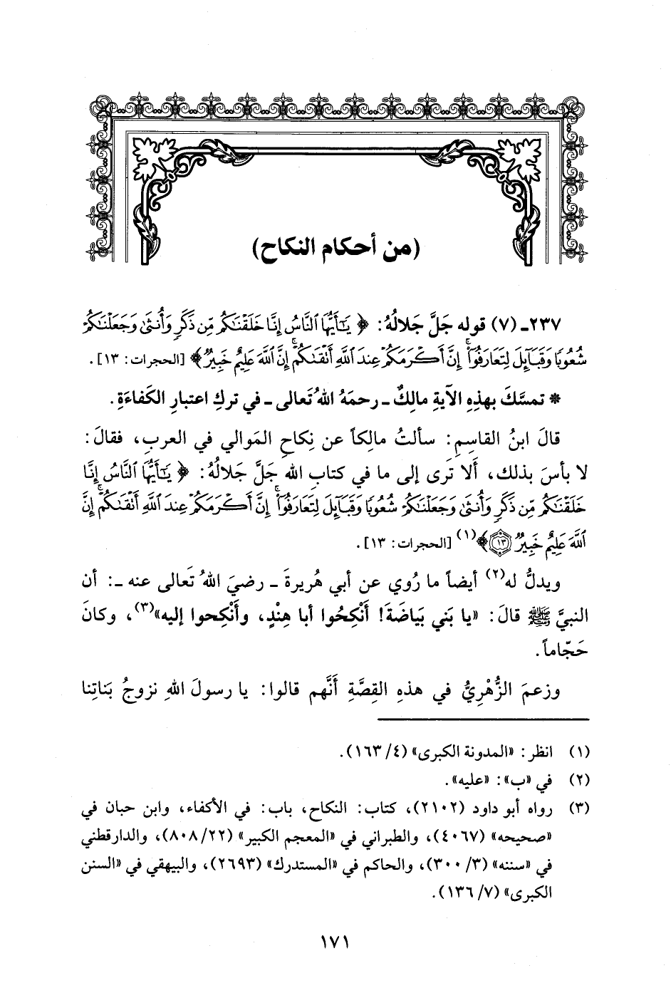 قَالَ ابنُ القاسِمِ: سألتُ مالِكاً عن نِكاحِ المَوالي في العربِ، فقالَ: لا بأسَ بذلك، أَلا تَرى إلى ما في كتابِ الله جَلَّ جَلالُهُ: {يَاأَيُّهَا النَّاسُ إِنَّا خَلَقْنَاكُمْ مِنْ ذَكَرٍ وَأُنْثَى وَجَعَلْنَاكُمْ شُعُوبًا وَقَبَائِلَ لِتَعَارَفُوا إِنَّ أَكْرَمَكُمْ عِنْدَ اللَّهِ أَتْقَاكُمْ إِنَّ اللَّهَ عَلِيمٌ خَبِيرٌ} (¬1) [الحجرات: 13].