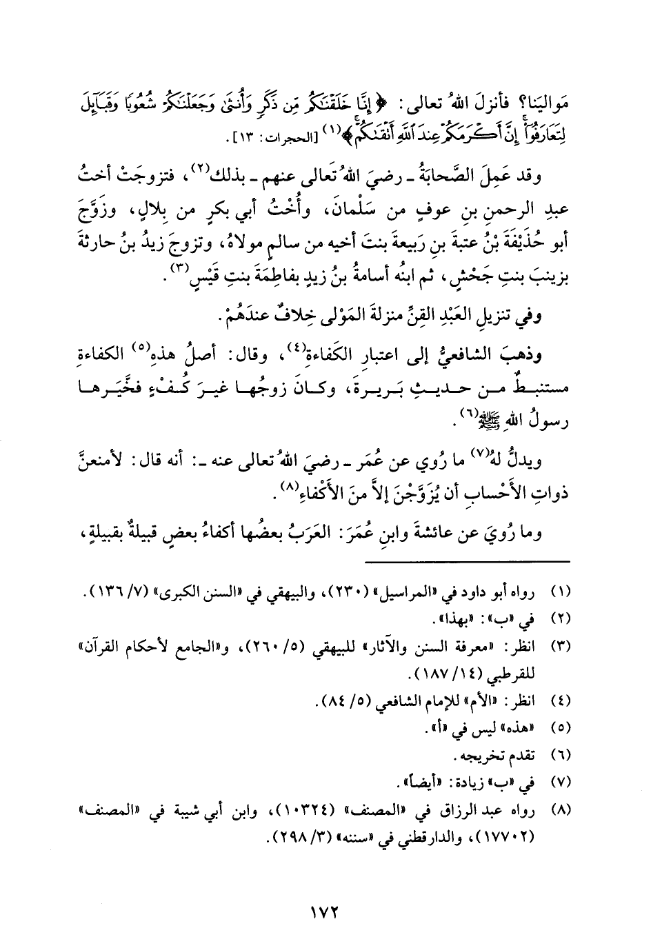 وما رُويَ عن عائشةَ وابنِ عُمَرَ: العَرَبُ بعضُها أكفاءُ بعضٍ قبيلةٌ بقبيلةٍ،