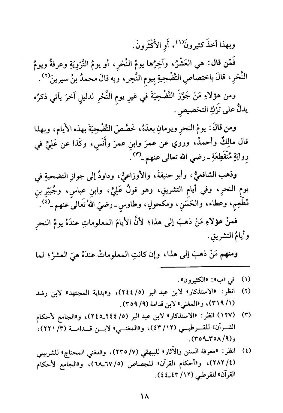 فَمْن قال: هي العَشْرُ، وآخِرُها يومُ النَّحْرِ، أو يومُ التَّرْوِيَةِ وعرفةُ ويومُ النَّحْرِ، قالَ باختصاصِ التَّضْحِيةِ بِيومِ النَّحِر، وبه قالَ محمدُ بنُ سيرينَ (¬2).