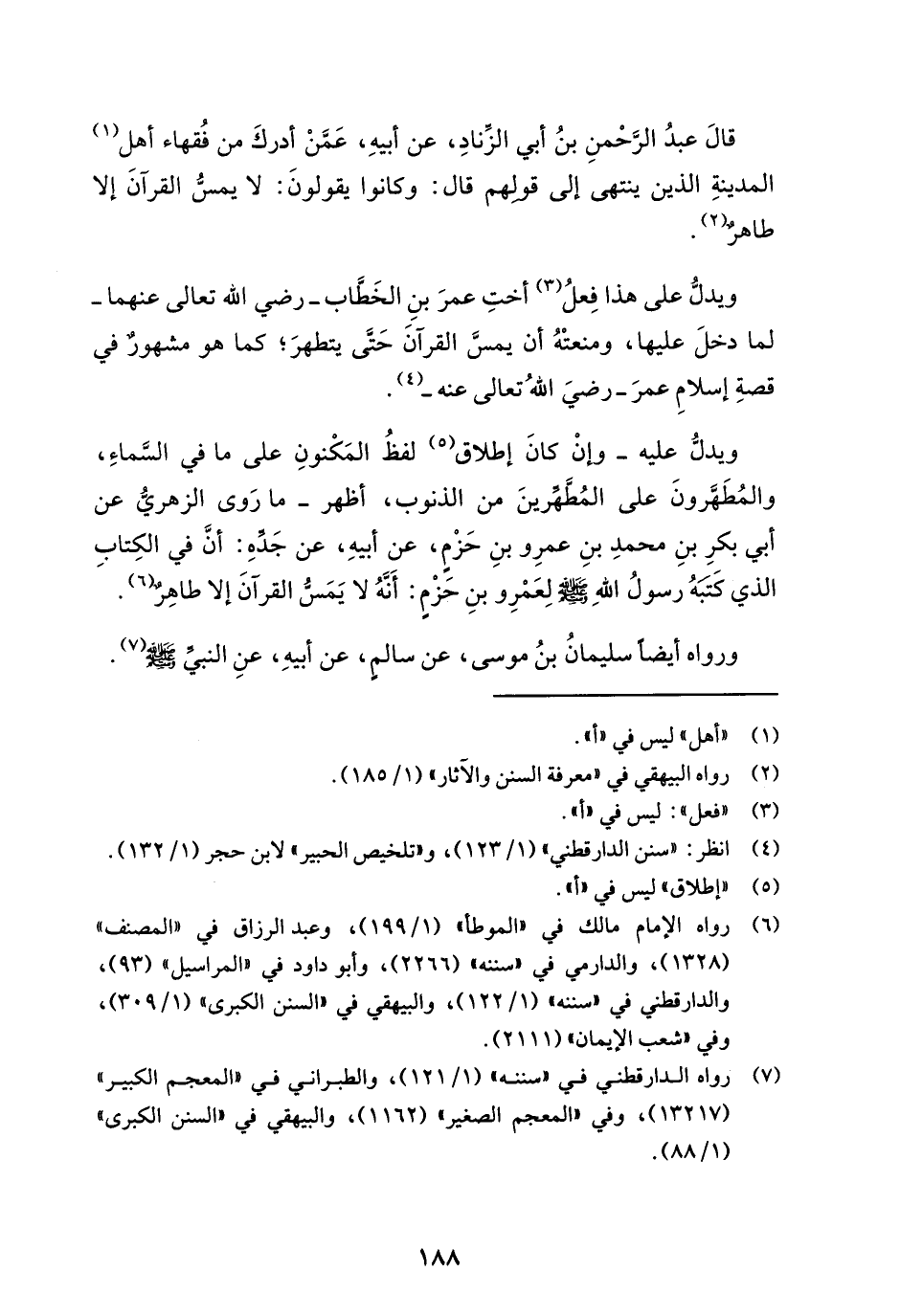 قَالَ عبدُ الرَّحمنِ بنُ أبي الزنادِ، عن أبيهِ، عَمَّنْ أدركَ من فُقهاء أهل (¬1) المدينةِ الذين ينتهى إلى قولهم قال: وكانوا يقولونَ: لا يمسُّ القرآن إلا طاهرٌ (¬2).