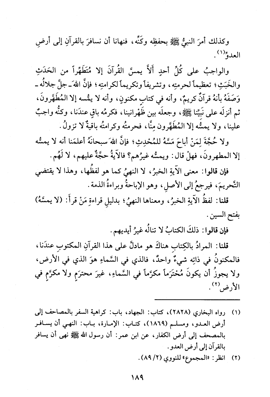وكذلك أمرَ النبيُّ - صلى الله عليه وسلم - بحفظِه وكَنِّه، فنهانا أن نسافرَ بالقرآنِ إلى أرضِ العدوِّ (¬1).