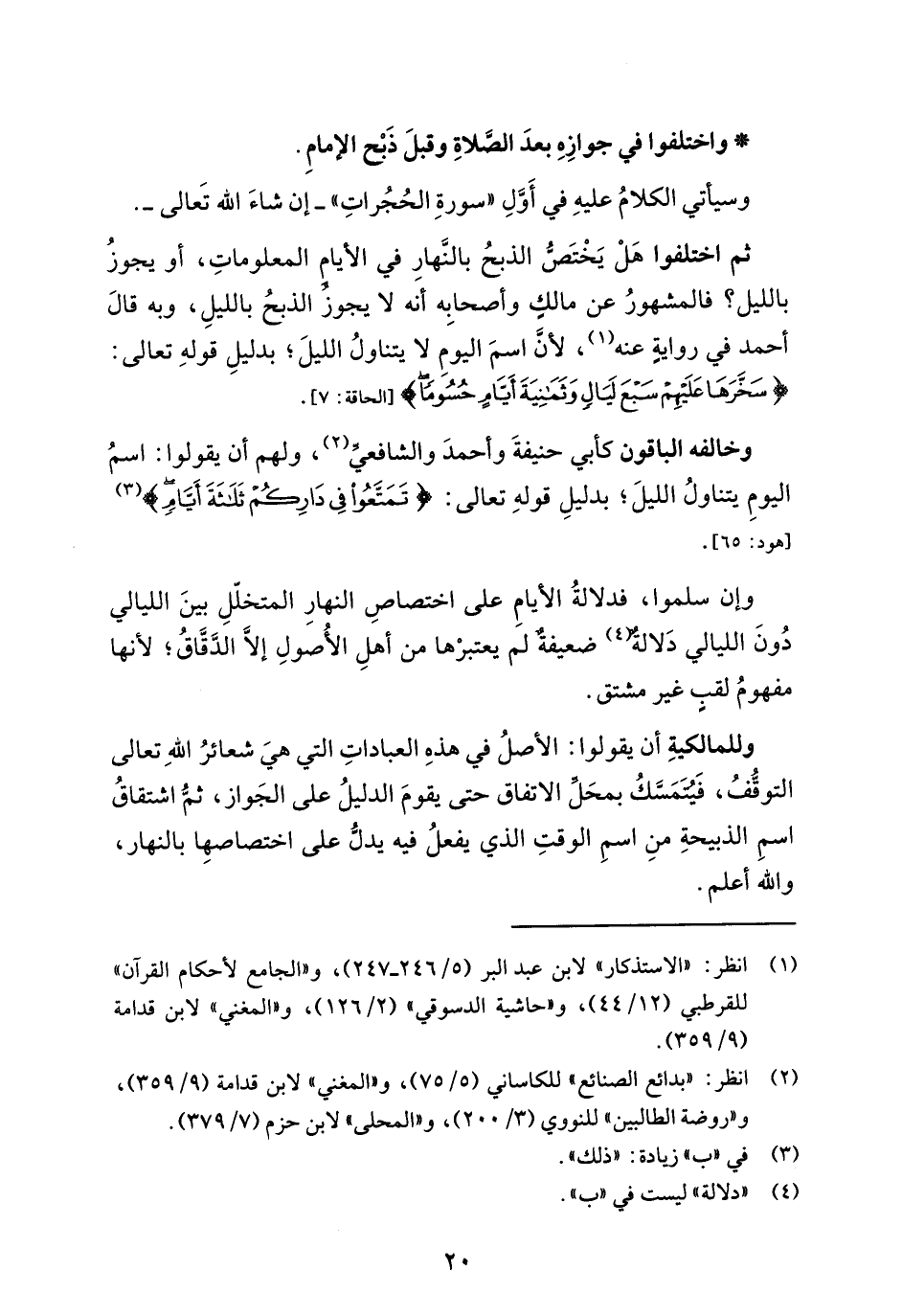 وللمالكيةِ أن يقولوا: الأصلُ في هذهِ العباداتِ التي هيَ شعائرُ اللهِ تعالى التوقُّفُ، فَيُتَمَسَّكُ بمحَل الاتفاق حتى يقومَ الدليلُ على الجَواز، ثمَّ اشتقاقُ اسمِ الذبيحةِ منِ اسمِ الوقتِ الذي يفعلُ فيه يدلُّ على اختصاصهِا بالنهار، والله أعلم.