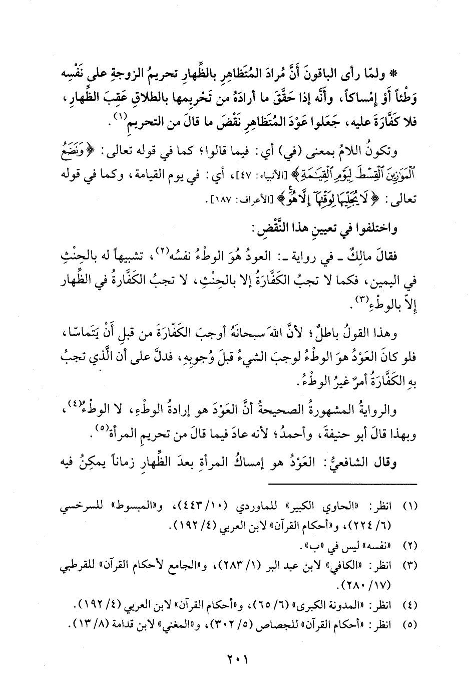 * ولمّا رأى الباقونَ أَنَّ مُرادَ المُتَظاهِرِ بالظِّهارِ تحريمُ الزوجةِ على نَفْسِه وَطْئاً أَوْ إمْساكاً، وأَنَّه إذا حَقَّقَ ما أرادَهُ من تَحْريِمها بالطلاقِ عَقِبَ الظِّهارِ، فلا كَفَّارَةَ عليه، جَعَلوا عَوْدَ المُتَظاهِرِ نَقْضَ ما قالَ من التحريمِ (¬1).