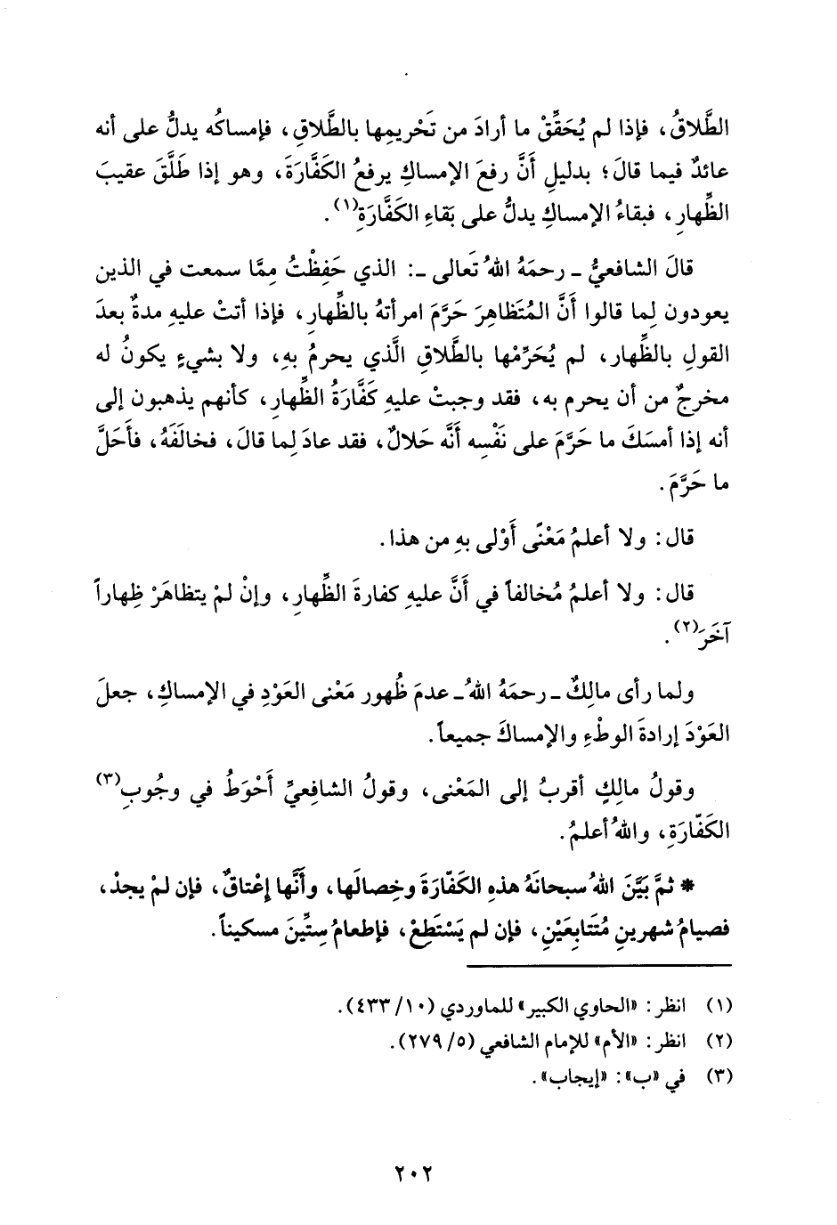 قالَ الشافعي - رحمَهُ اللهُ تَعالى-: الذي حَفِظْتُ مِمَّا سمعت في الذين يعودون لِما قالوا أَنَّ المُتَظاهِرَ حَرَّمَ امرأتهُ بالظهارِ، فإذا أتتْ عليهِ مدةٌ بعدَ القولِ بالظهار، لم يُحَرِّمْها بالطَّلاقِ الَّذي يحرمُ بهِ، ولا بشيءٍ يكونُ له مخرجٌ من أن يحرم به، فقد وجبتْ عليهِ كَفارَةُ الطهارِ، كأنهم يذهبون إلى أنه إذا أمسَكَ ما حَرَّمَ على نَفْسِه أنه حَلالٌ، فقد عادَ لِما قالَ، فخالَفَهُ، فأَحَلَّ ما حَرَّمَ.