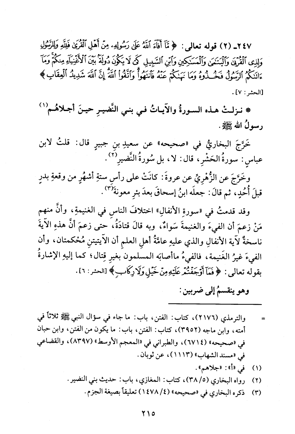 247 - (2) قوله تعالى: {مَا أَفَاءَ اللَّهُ عَلَى رَسُولِهِ مِنْ أَهْلِ الْقُرَى فَلِلَّهِ وَلِلرَّسُولِ وَلِذِي الْقُرْبَى وَالْيَتَامَى وَالْمَسَاكِينِ وَابْنِ السَّبِيلِ كَيْ لَا يَكُونَ دُولَةً بَيْنَ الْأَغْنِيَاءِ مِنْكُمْ وَمَا آتَاكُمُ الرَّسُولُ فَخُذُوهُ وَمَا نَهَاكُمْ عَنْهُ فَانْتَهُوا وَاتَّقُوا اللَّهَ إِنَّ اللَّهَ شَدِيدُ الْعِقَابِ} [الحشر: 7].