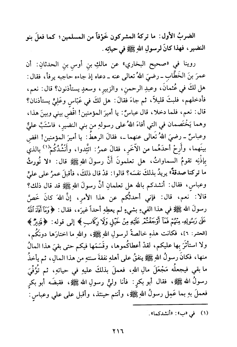 روينا في "صحيح البخاري" عن مالكِ بنِ أوسِ بنِ الحدثانِ: أن عمرَ بنَ الخَطَّابِ -رضيَ اللهُ تعالى عنه - دعاه إذ جاءه حاجبه يرفأ، فقال: هل لكَ في عُثمانَ، وعبدِ الرحمنِ، والزبيرِ، وسعدٍ يستأذنون؟ قال: نعم، فأدخلهم، فلبثَ قليلاً، ثم جاءَ فقالَ: هل لكَ في عَبّاسٍ وعَلِيٍّ يستأذنان؟ قال: نعم، فلما دخلا، قال عباس: يا أميرَ المؤمنين! اقْضِ بيني وبينَ هذا، وهما يَخْتَصمان في التي أفاءَ اللهُ على رسولهِ من بني النضيرِ، فاسْتَبَّ عليٌّ وعباسٌ -رضيَ اللهُ تَعالى عنهما -، فقالَ الرهطُ: يا أميرَ المؤمنين! اقضِ بينَهما، وأَرِحْ أحدَهُما من الآخَرِ، فقالَ عمرُ: اتئدوا، وأَنْشُدُكُمْ (¬1) بالذي بِإذْنِه تقومُ السماواتُ، هل تعلمونَ أَن رسولَ اللهِ - صلى الله عليه وسلم - قال: "لا نُورثُ ما تركنا صدقة" يريدُ بذلكَ نفسَه؟ قالوا: قدْ قال ذلكَ، فأقبلَ عمرُ على عليٍّ وعباسٍ، فقال: أنشدكم بالله هل تعلمانِ أنَّ رسولَ اللهِ - صلى الله عليه وسلم - قد قال ذلك؟ قالا: نعم، قال: فإني أحدثُكم عن هذا الأمرِ، إنَّ اللهَ كانَ خَصَّ رسولَ الله - صلى الله عليه وسلم - في هذا الفيءِ بشيءٍ لم يعطِهِ أحدًا غيرَه، فقال: {وَمَا أَفَاءَ اللَّهُ عَلَى رَسُولِهِ مِنْهُمْ فَمَا أَوْجَفْتُمْ عَلَيْهِ مِنْ خَيْلٍ وَلَا رِكَابٍ} إلى قوله: {قَدِيرٌ} [الحشر: 6] , فكانت هذهِ خالصةً لرسولِ اللهِ - صلى الله عليه وسلم -، واللهِ ما اختارَها دونَكُم، ولا استأثَرَ بِها عليكم، لقدْ أعطاكُموها، وقَسَمَها فيكم حتى بقيَ هذا المالُ منها، فكان رسولُ اللهِ - صلى الله عليه وسلم - ينفقُ على أهلهِ نفقةَ سنتهِ من هذا المالِ، ثم يأخذُ ما بقي فيجعلُه مَجْعَلَ مالِ اللهِ، فعملَ بذلكَ عليهِ في حياتهِ، ثم تُوُفِّيَ رسولُ الله - صلى الله عليه وسلم -، فقال أبو بكرٍ: فأنا وليُّ رسولِ الله - صلى الله عليه وسلم -، فقبضَه أبو بكرٍ فعملَ بهِ بما عَمِل رسولُ اللهِ - صلى الله عليه وسلم -، وأنتم حينئذ، وأقبل على علي وعباسٍ: