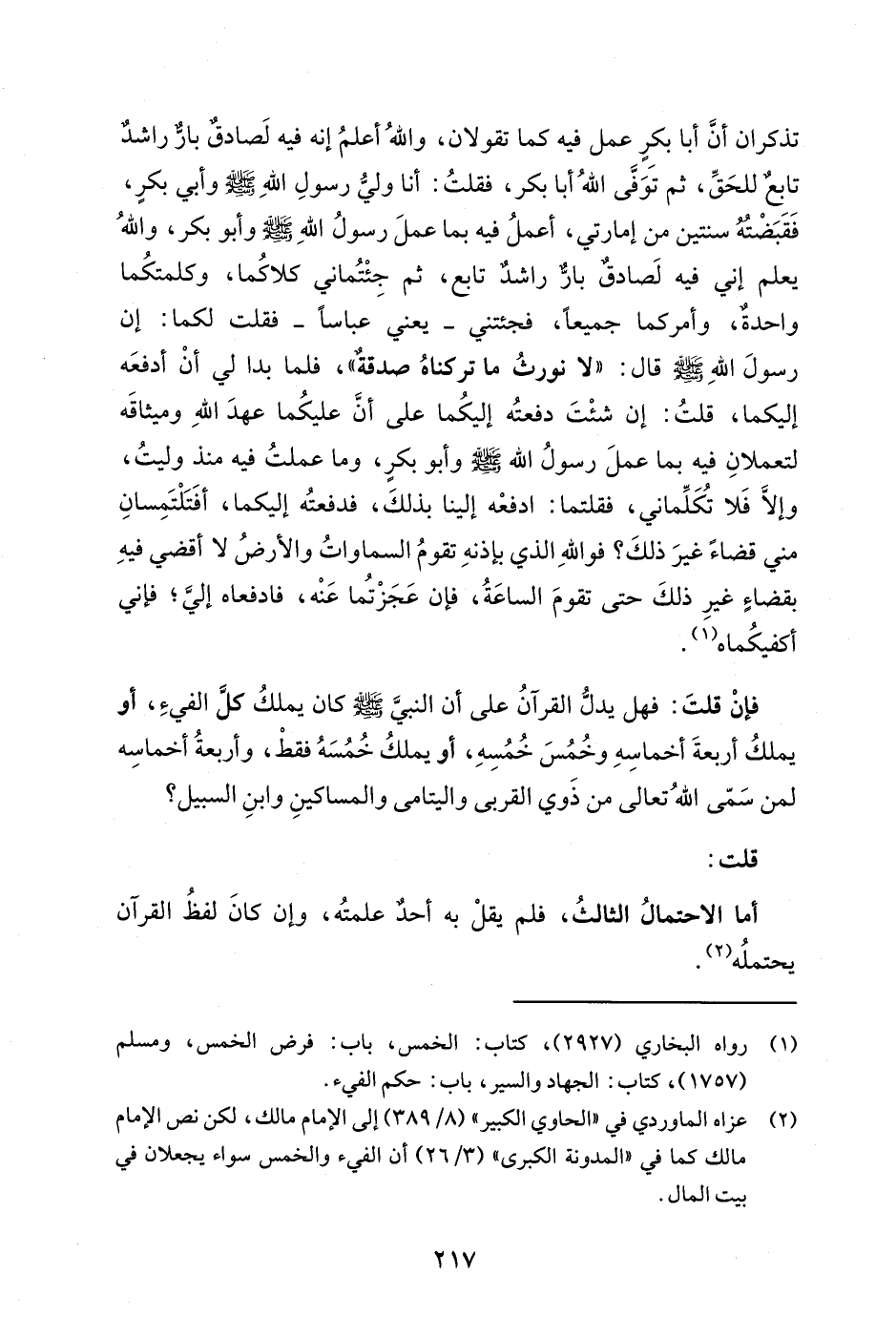 فإنْ قلتَ: فهل يدلُّ القرآنُ على أن النبيَّ - صلى الله عليه وسلم - كان يملكُ كلَّ الفيءِ، أو يملكُ أربعةَ أخماسِهِ وخُمُسَ خُمُسِهِ، أو يملكُ خُمُسَهُ فقطْ، وأربعةُ أخماسِه لمن سَمّى اللهُ تعالى من ذَوي القربى واليتامى والمساكينِ وابنِ السبيل؟