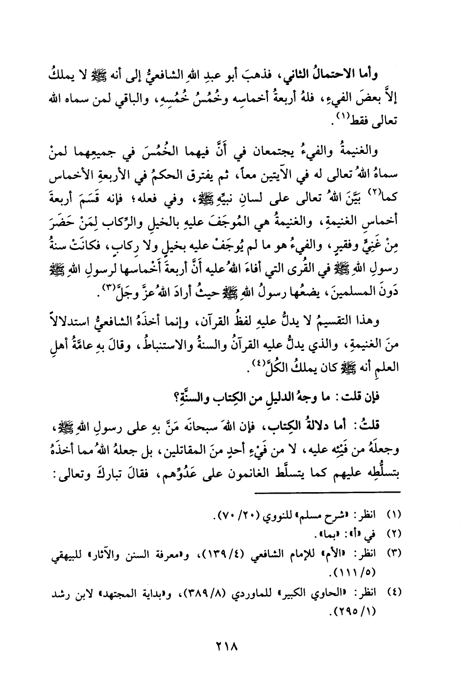 وهذا التقسيمُ لا يدلُّ عليهِ لفظُ القرآن، وإنما أخذَهُ الشافعي استدلالاً منَ الغنيمةِ، والذي يدلُّ عليه القرآنُ والسنةُ والاستنباطُ، وقالَ بهِ عامَّةُ أهلِ العلمِ أنه - صلى الله عليه وسلم - كان يملكُ الكُل (¬4).