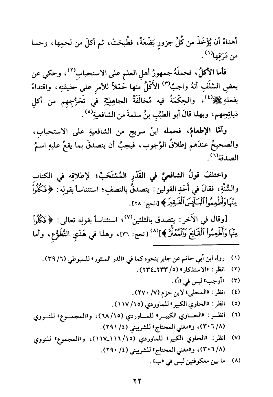 فأما الأكلُ، فحملَهُ جمهورُ أهلِ العلمِ على الاستحبابِ (¬2)، وحكي عن بعضِ السَّلَفِ أنهُ واجبٌ (¬3) الأَكْلُ منها حَمْلًا للأمرِ على حقيقتِه، واقتداءَ بفعلهِ - صلى الله عليه وسلم - (¬4)، والحِكْمَةُ فيه مُخالَفَةُ الجاهِلِيَّةِ في تَحَرُّجِهِم من أكلِ ذبائِحِهم، وبهذا قالَ أبو الطيبِ بنُ سلمةَ من الشافعيةِ (¬5).