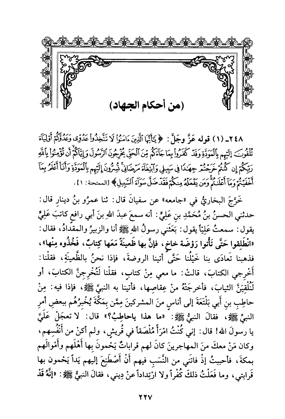 248 - (1) قوله عَزَّ وجَلَّ: {يَاأَيُّهَا الَّذِينَ آمَنُوا لَا تَتَّخِذُوا عَدُوِّي وَعَدُوَّكُمْ أَوْلِيَاءَ تُلْقُونَ إِلَيْهِمْ بِالْمَوَدَّةِ وَقَدْ كَفَرُوا بِمَا جَاءَكُمْ مِنَ الْحَقِّ يُخْرِجُونَ الرَّسُولَ وَإِيَّاكُمْ أَنْ تُؤْمِنُوا بِاللَّهِ رَبِّكُمْ إِنْ كُنْتُمْ خَرَجْتُمْ جِهَادًا فِي سَبِيلِي وَابْتِغَاءَ مَرْضَاتِي تُسِرُّونَ إِلَيْهِمْ بِالْمَوَدَّةِ وَأَنَا أَعْلَمُ بِمَا أَخْفَيْتُمْ وَمَا أَعْلَنْتُمْ وَمَنْ يَفْعَلْهُ مِنْكُمْ فَقَدْ ضَلَّ سَوَاءَ السَّبِيلِ (1)} [الممتحنة: 1]ـ.