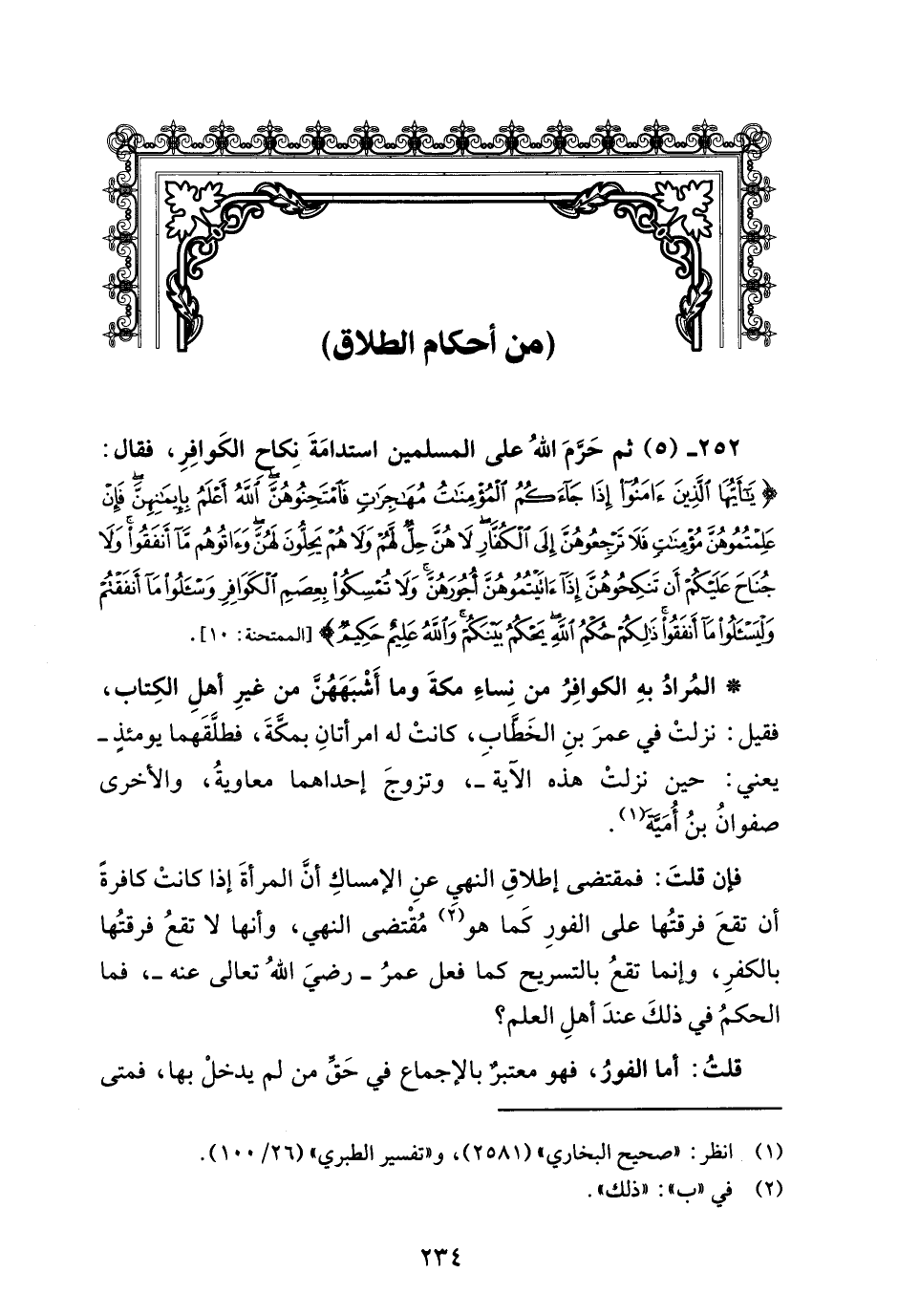 252 - (5) ثم حَرَّمَ اللهُ على المسلمين استدامَةَ نِكاح الكَوافِرِ، فقال: {يَاأَيُّهَا الَّذِينَ آمَنُوا إِذَا جَاءَكُمُ الْمُؤْمِنَاتُ مُهَاجِرَاتٍ فَامْتَحِنُوهُنَّ اللَّهُ أَعْلَمُ بِإِيمَانِهِنَّ فَإِنْ عَلِمْتُمُوهُنَّ مُؤْمِنَاتٍ فَلَا تَرْجِعُوهُنَّ إِلَى الْكُفَّارِ لَا هُنَّ حِلٌّ لَهُمْ وَلَا هُمْ يَحِلُّونَ لَهُنَّ وَآتُوهُمْ مَا أَنْفَقُوا وَلَا جُنَاحَ عَلَيْكُمْ أَنْ تَنْكِحُوهُنَّ إِذَا آتَيْتُمُوهُنَّ أُجُورَهُنَّ وَلَا تُمْسِكُوا بِعِصَمِ الْكَوَافِرِ وَاسْأَلُوا مَا أَنْفَقْتُمْ وَلْيَسْأَلُوا مَا أَنْفَقُوا ذَلِكُمْ حُكْمُ اللَّهِ يَحْكُمُ بَيْنَكُمْ وَاللَّهُ عَلِيمٌ حَكِيمٌ (10)} [الممتحنة: 10].