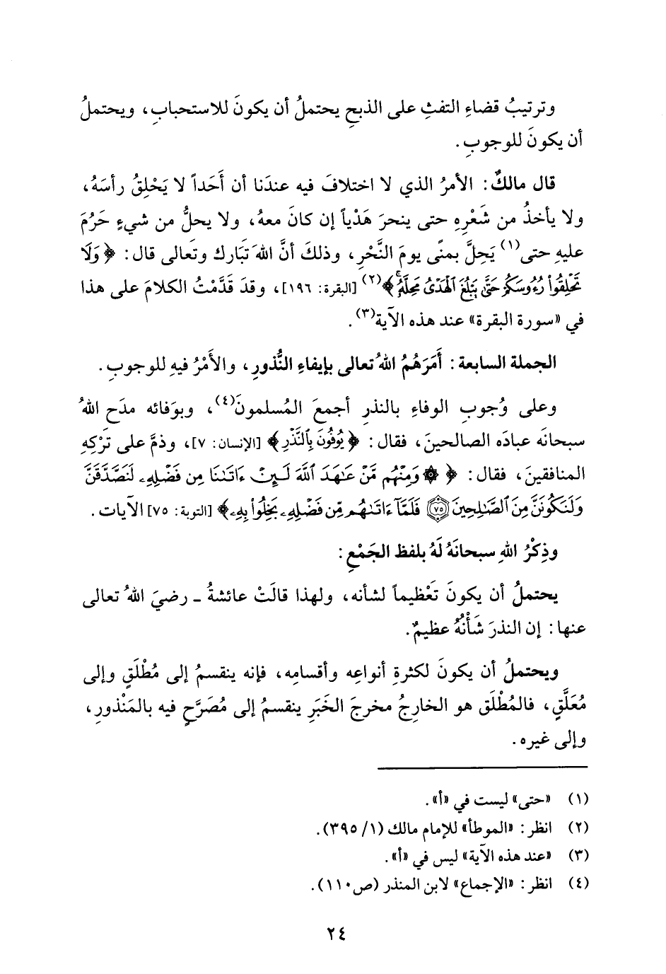 الجملة السابعة: أَمَرَهُمُ اللهُ تعالى بإيفاءِ النُّذورِ، والأَمْرُ فيهِ للوجوبِ.