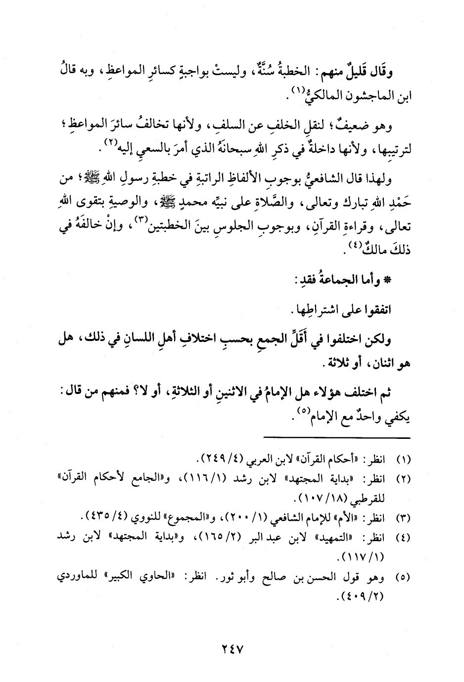 وقَال قَليلٌ منهم: الخطبةُ سُنَّةٌ، وليستْ بواجبةِ كسائرِ المواعظِ، وبه قالُ ابن الماجشون المالكيُّ (¬1).
