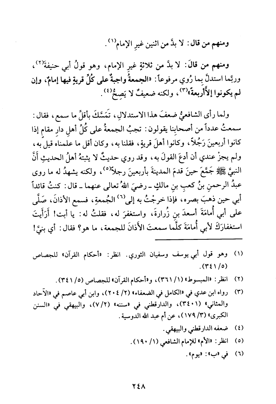 ومنهم من قالَ: لا بدَّ من ثلاثةٍ غيرِ الإمام، وهو قولُ أبي حنيفة (¬2)، وربَّما استدلَّ بما رُوي مرفوعاً: "الجمعةُ واجبةٌ على كلِّ قريةٍ فيها إمامٌ، وإن لم يكونوا إلَّا أرَبعةً" (¬3)، ولكنه ضعيفٌ لا يَصِحُّ (¬4).