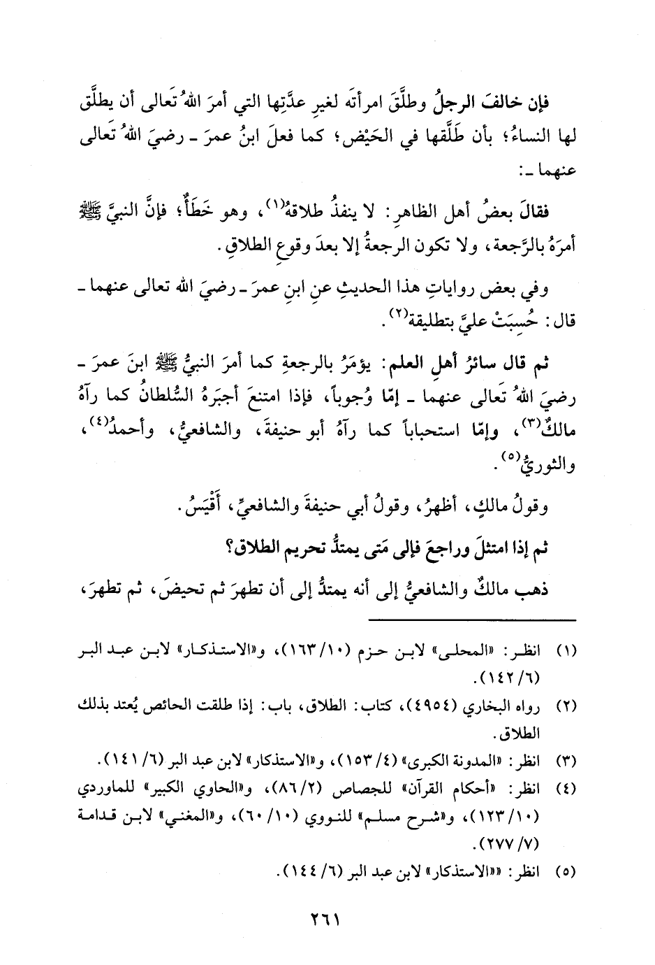 ثم قال سائرُ أهلِ العلم: يؤمَرُ بالرجعةِ كما أمرَ النبيّ -صَلَّى الله عليه وسلم - ابنَ عمرَ -رضيَ اللهُ تَعالى عنهما- إمّا وُجوباً، فإذا امتنعَ أجبَرهُ السُّلطانُ كما رآهُ مالكٌ (¬3)، وإمّا استحباباً كما رآهُ أبو حنيفةَ، والشافعيّ، وأحمدُ (¬4)، والثوريُّ (¬5).